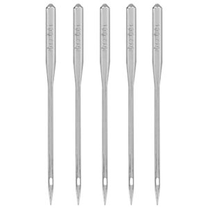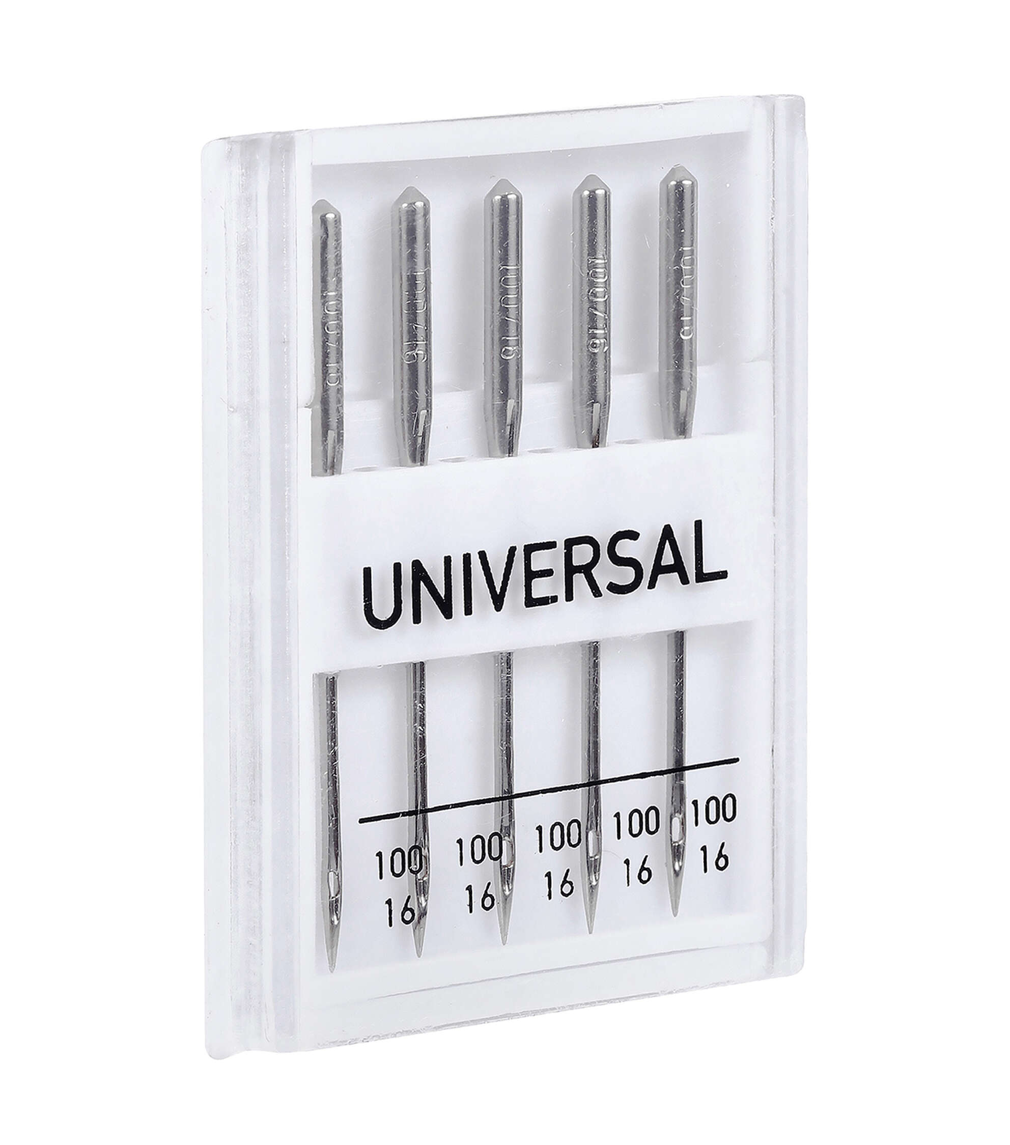 - Top Notch Universal Machine Needles in Size 100/16 are a set of 5 sewing machine needles for use with heavyweight fabric. Coated with durable nickel-plated steel, these heavy duty machine needles are universal, meaning they are compatible with most household domestic sewing machine. Size 100/16 needles are ideal for heavyweight fabrics like denim, leather, upholstery, and other heavyweight fabrics . Crafted from durable, nickel-plated steel, these strong sewing machine needles are built to last. For safety, keep these and all needles away from children. The set comes in a transparent compact case that shows the sizes marked on its cover so you can keep your needles neat and organized. This versatile machine needle set is the perfect starter set for your sewing machine supplies kit.