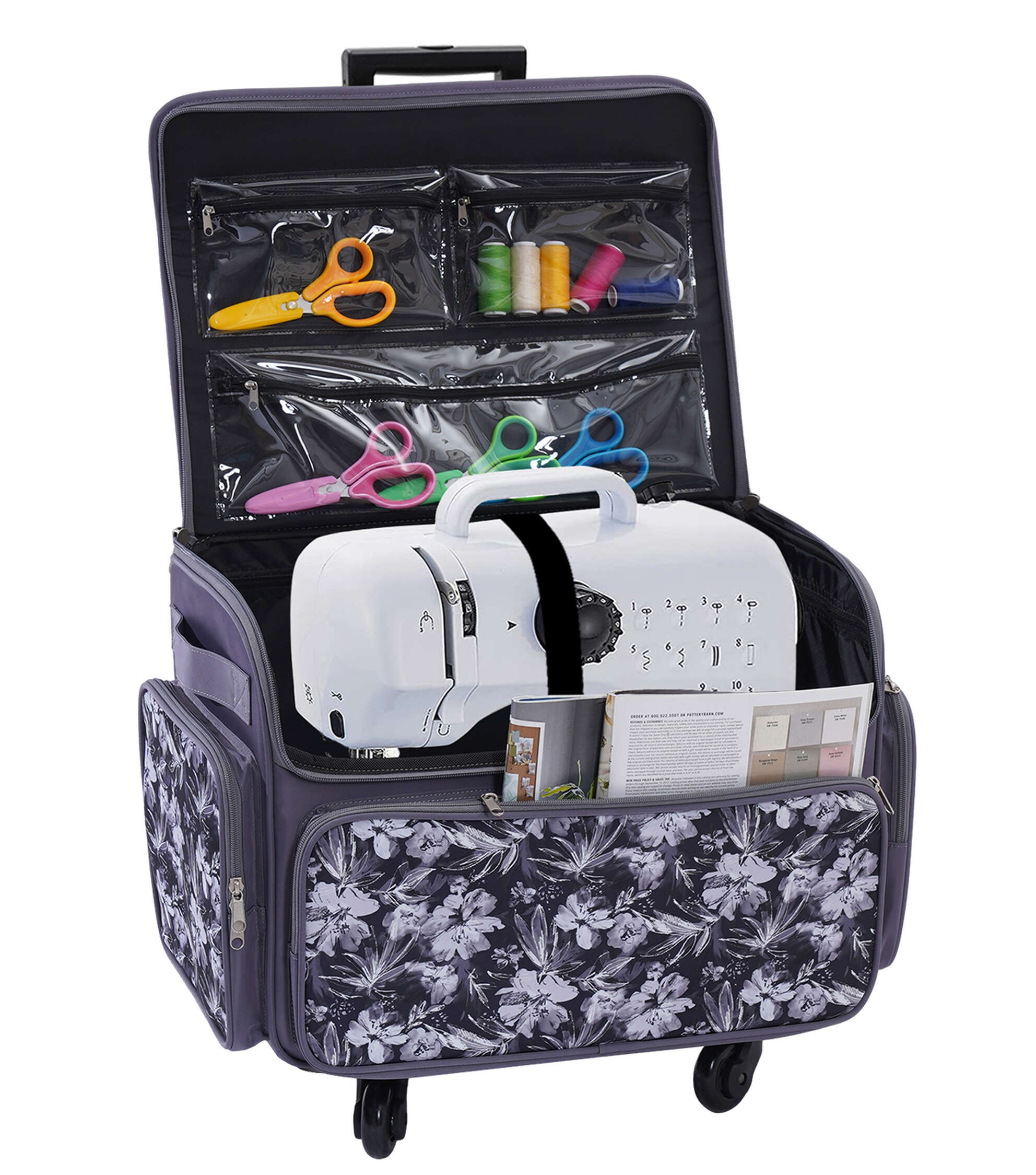 Stay Organized and Stylish with the 13″ x 18″ Purple & Black Floral Rolling Sewing Storage Tote by Top Notch