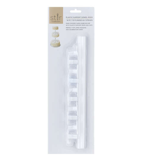 The STIR Plastic Support Dowel Rods – White are just what you need to give stability and support for tiered cakes. This pack includes 10 flanges to ensure leveled placement of cake layers and four rods that can be cut into your preferred measurements. For better structure, use them with center core rods, sold separately.