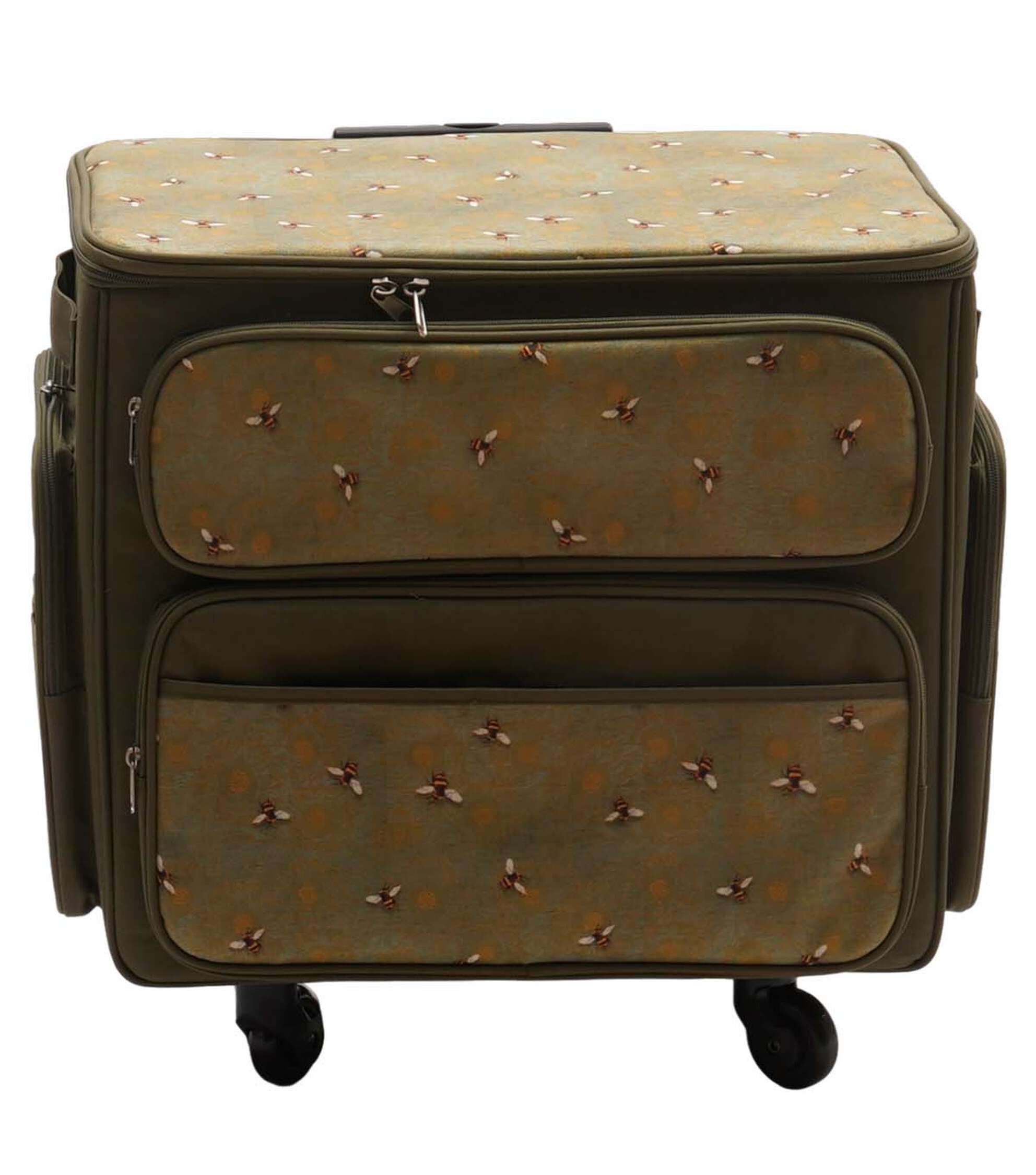 Conveniently Store and Transport Your Sewing Supplies with the 20″ x 13″ Bees on Green Rolling Sewing Storage Tote by Top Notch