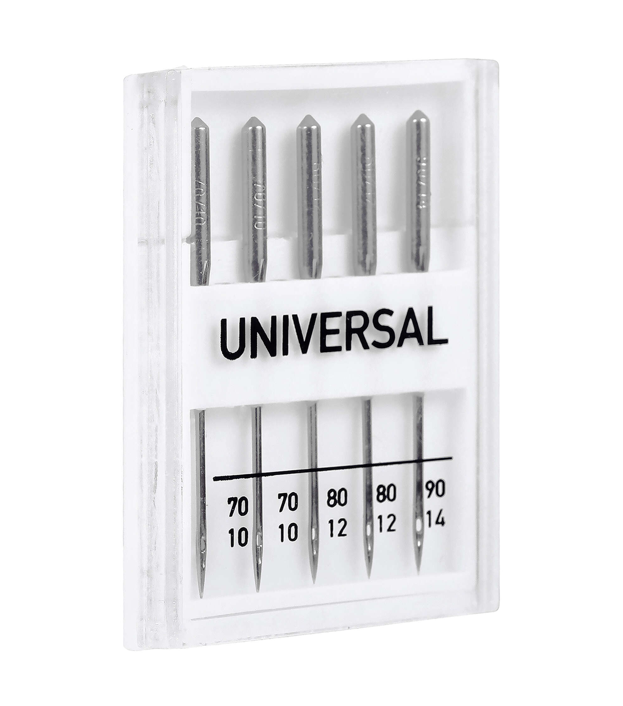 - Top Notch Universal Machine Needles in Assorted Sizes are a set of 5 sewing machine needles for use with most woven and knit fabrics. Coated with durable nickel-plated steel, these all-purpose machine needles are universal, meaning they are compatible with most household domestic sewing machine. Select the needle size based on the type and weight of your fabric. The set includes two size 70/10 needles designed for use with very sheer or lightweight fabrics, two 80/12 needles for lightweight fabrics, and one 90/14 needle for use with medium weight fabrics. Crafted from durable, nickel-plated steel, these strong sewing machine needles are built to last. For safety, keep these and all needles away from children. The set comes in a transparent compact case that shows the sizes marked on its cover so you can keep your needles neat and organized. This versatile machine needle set is the perfect starter set for your sewing machine supplies kit.