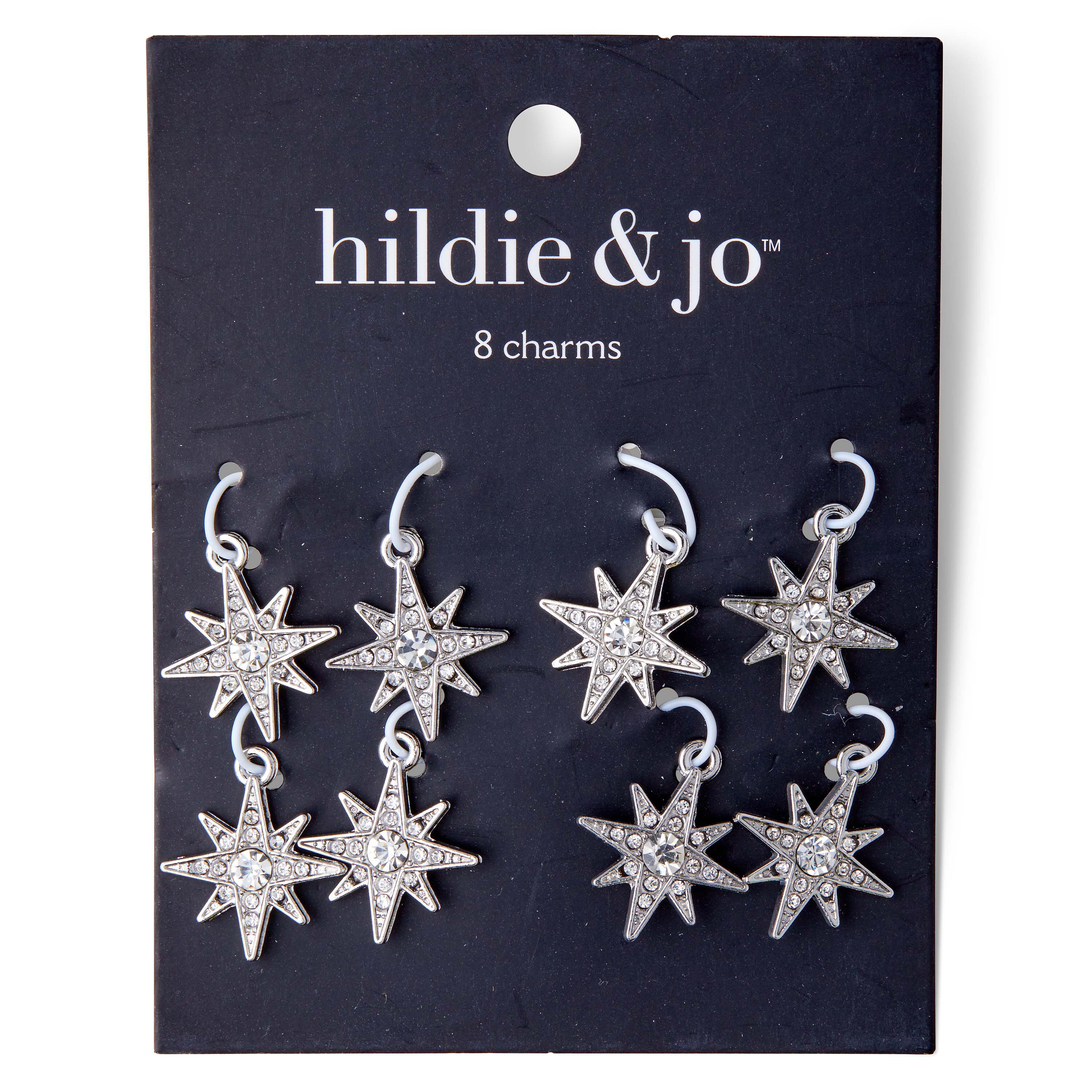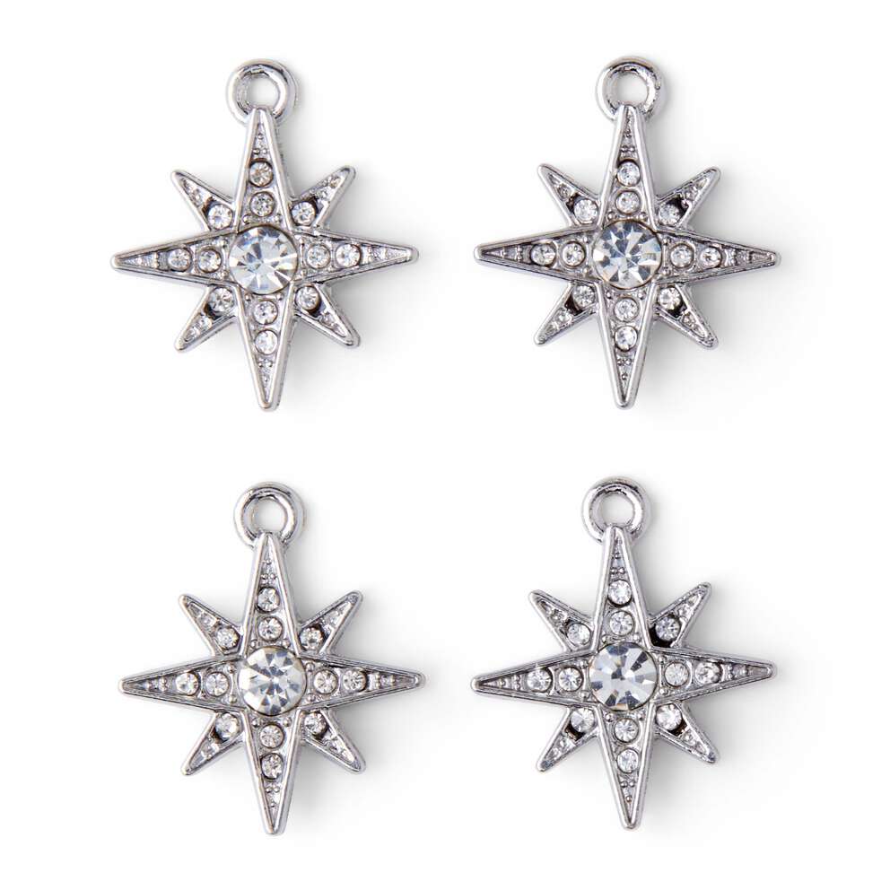 Design personalized craft projects using these hildie & jo Boulevard Point Star Silver Charms-Clear Crystals. In silver, these eight charms feature a large round clear crystal in the center and smaller clear crystals embedded on the points. Add these eight point star charms to bracelets, necklaces, keychains and more.