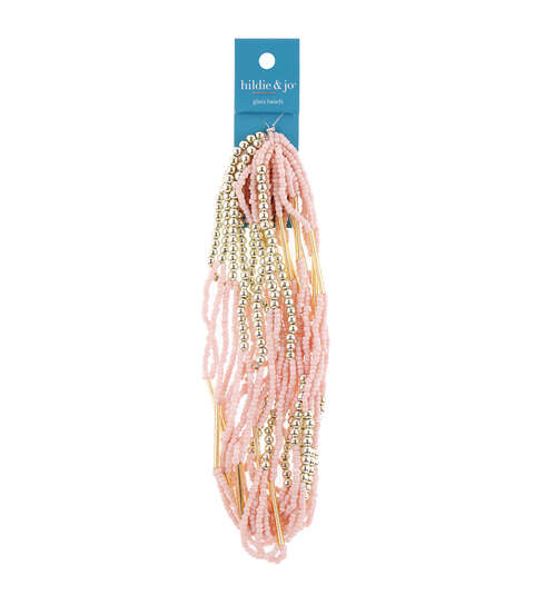 Lend an enchanting touch to your jewelry creations using the hildie & jo Glass Seed Strung Beads – Pink & Gold. This pack contains multiple strands of seed beads made of glass and sporting a beautiful shade of pink. Pair them with delicate shells and charms for added visual beauty.