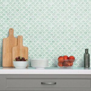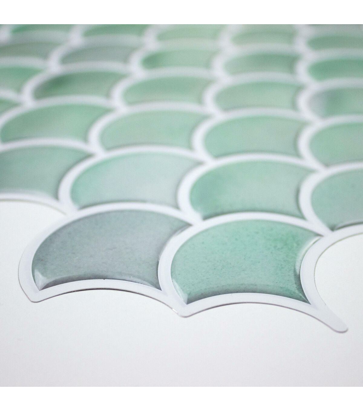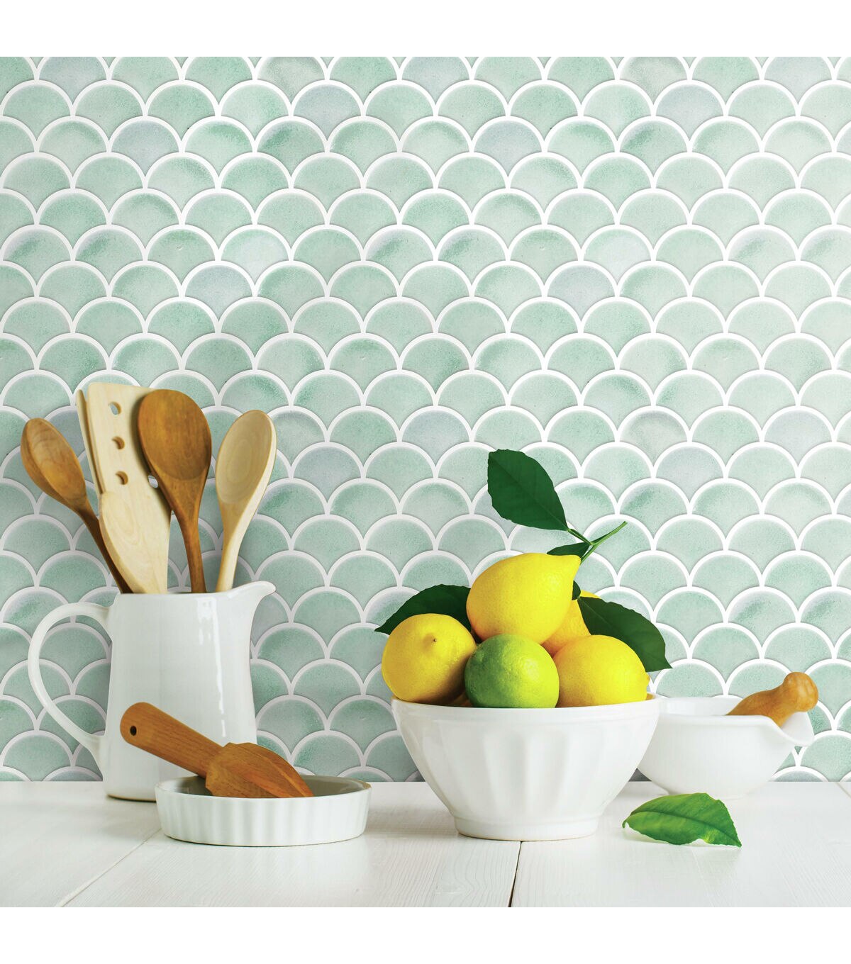 Soft seafoam tones marry with a stylized arch design reminiscent of a scallop shell in RoomMates”?Aqua Scallop peel and stick StickTiles. Hints of gray and beige peek through the green to blue watercolors making this the perfect backsplash for any home by the sea or that would like to emulate the seashore. StickTiles have a 3D glossy finish giving you the look and feel of genuine designer tiles. But unlike real tiles, you do not need heavy equipment (such as a wet saw) to cut them, nor do you need messy grout or additional paste. Simply use a utility knife or scissors to trim to size and work around difficult areas like corners or outlets”?and just peel and stick! Ideal in kitchens, baths, and bar areas, our StickTiles are the go-to solution for do-it-yourself easy and affordable new backsplash décor installed with regular household tools. RoomMates StickTiles help you decorate in minutes. 4 Tiles 10.5 inch x 10.5 inch 2.53 sq. ft