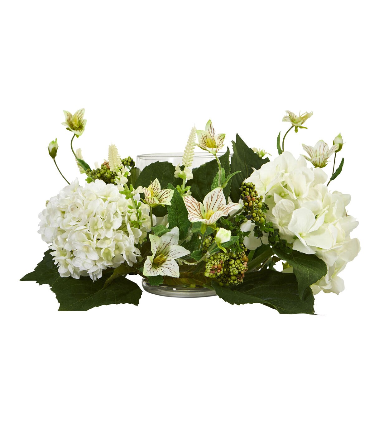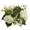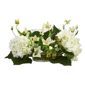 It’s hard to know where to start looking with this artificial hydrangea candelabrum! The large white flowers look soft to the touch, surrounded by other small blooms and rich leaves. No need to have additional decor on your dresser or table to complement this piece; it makes a statement all on its own. Silk floral arrangements are manufactured using synthetic materials and are well designed and constructed to be life-like in appearance.