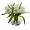 Tulips are known for being part of the lily family, with bulbous cup shaped flowers and bright colors. This makes these cheerful flowers a welcome addition to any home or office environment. Available in a pristine white color, these tulips are housed in a functional, yet decorative vase (with Liquid Illusion faux water) that fits easily within any style of decor.Silk floral arrangements are manufactured using synthetic materials and are well designed and constructed to be life-like in appearance.