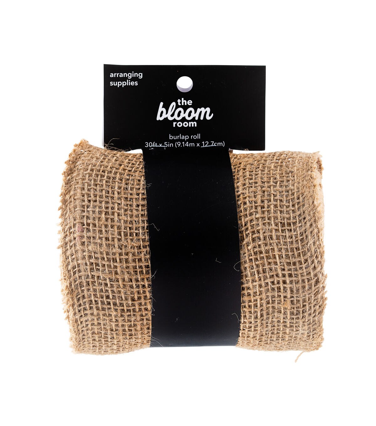 Add color and texture to flower arrangements using the Bloom Room Burlap Roll. It measures 10 yards to add color and texture to flower arrangements and home decor accents. Use it to create a stunning candle display or table accent. Weave it into wreaths, wrap vases or make burlap flowers. This natural burlap roll is 100% woven and comes with finished edges.