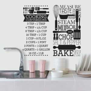 Make cooking easy with these Cooking Conversion wall decals from RoomMates. Perfect for the cook in your home, these cooking conversion wall stickers are easy to remove and reposition. To apply, remove the wall sticker from the peel and stick backing and apply to the surface of your choice. Watch your kitchen transform in minutes!