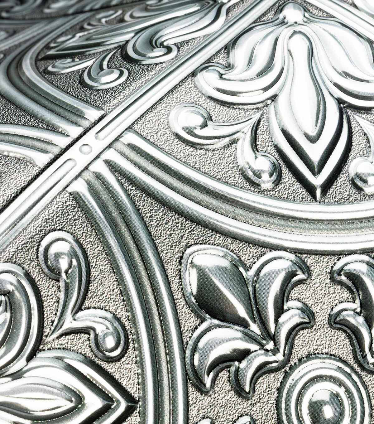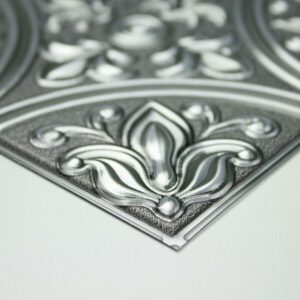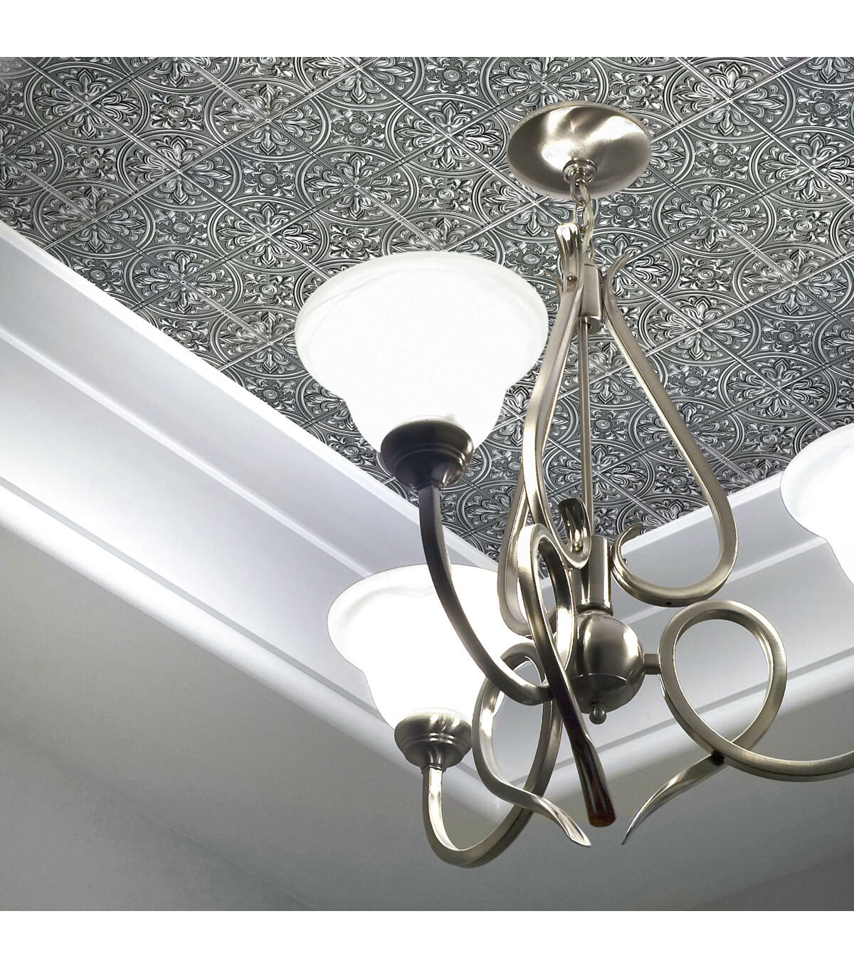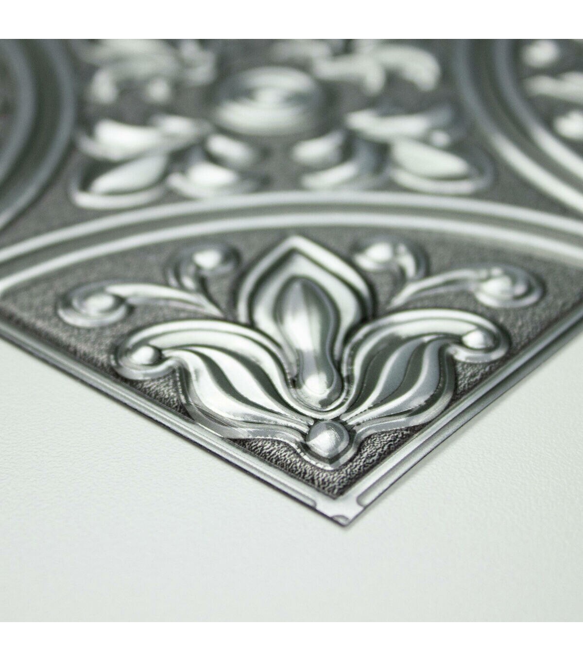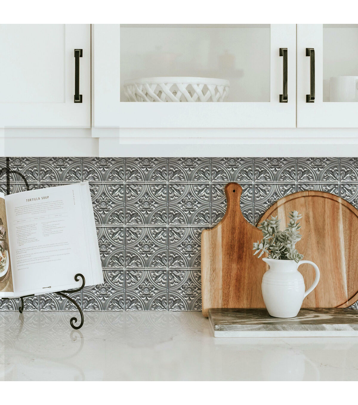 The classic beauty of Victorian tin tiles is interpreted into easy and affordable current design with these Silver Tin Peel and Stick StickTiles from RoomMates. Originally designed to imitate the exquisite ceiling plasterwork of grand European homes, faux pressed tin designs are now fashionably used for art-work, back splashes, cabinet faces, wainscoting and more. The 3D/embossed design elements within the tile capture timeless motifs like the fleur de lis, acanthus scrolls, medallions and architectural gridwork. Burnished metal finish in soft silver make these StickTiles the perfect accompaniment to any home décor with metal accents. RoomMates StickTiles are easy to clean and are the go-to solution for do-it-yourself easy and affordable décor installed with regular household tools, helping you decorate in minutes. 4 Tiles 10.5 inch x 10.5 inch 3.07 sq. ft.