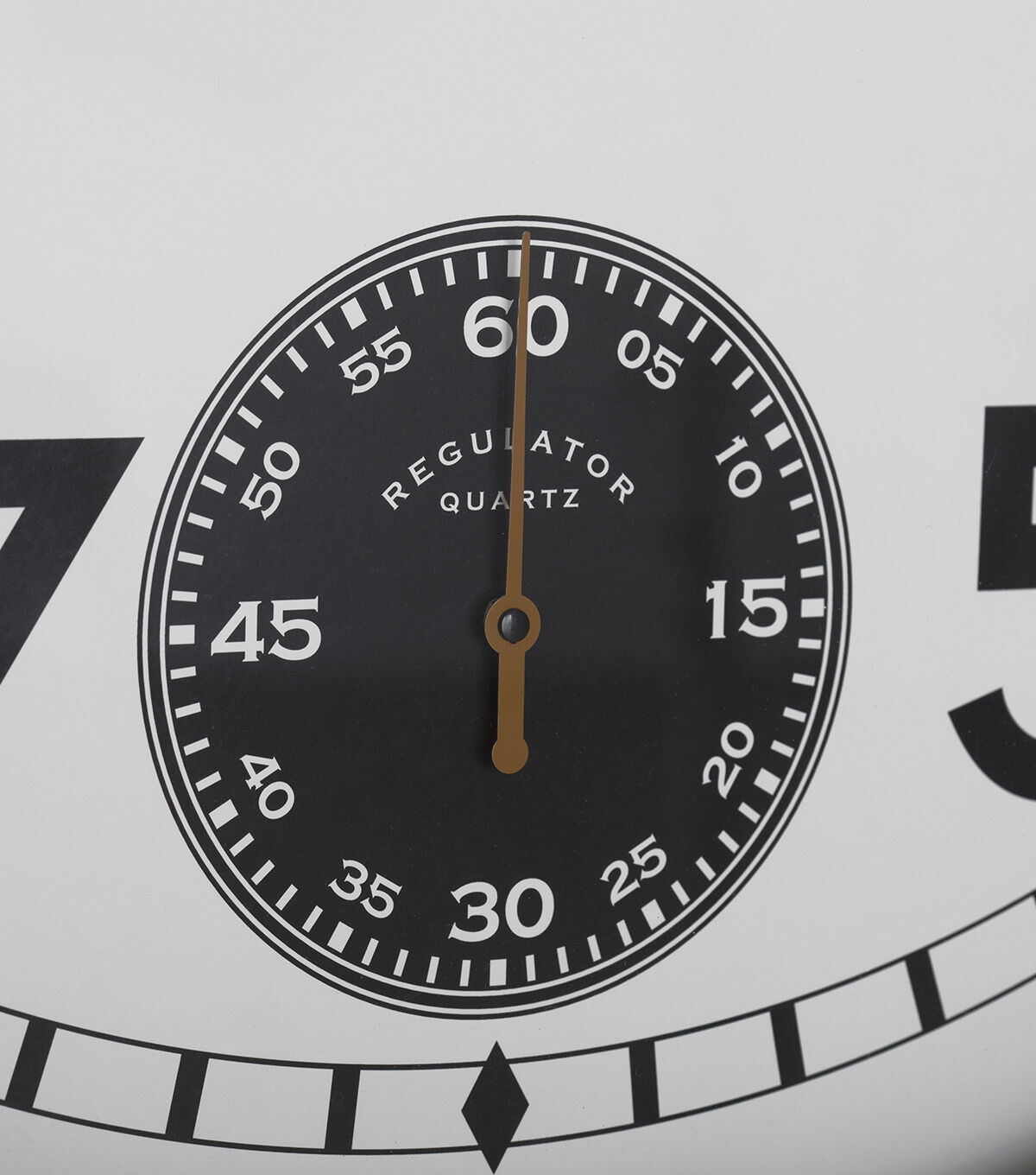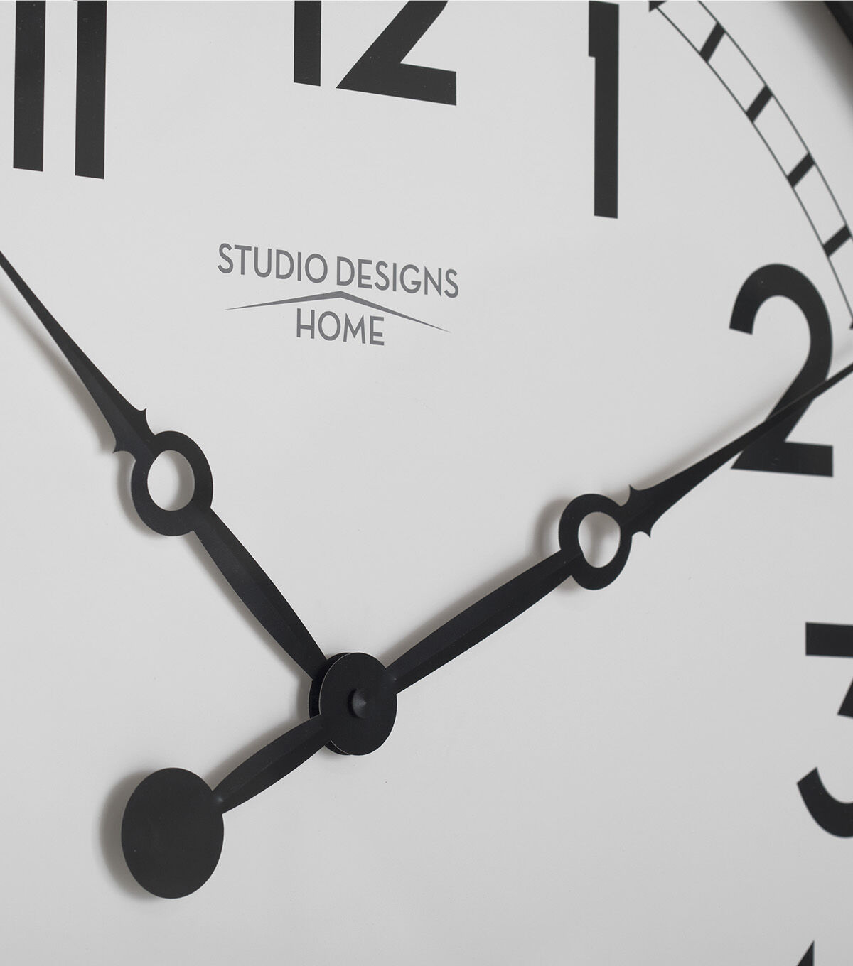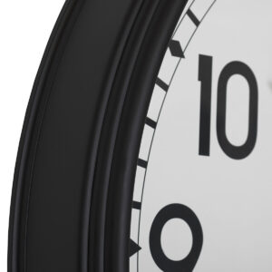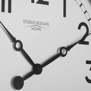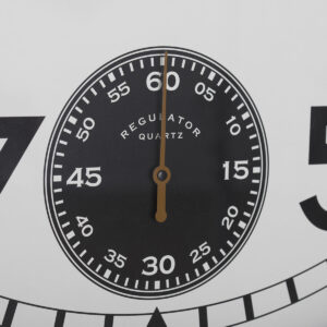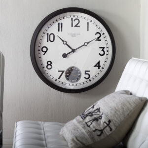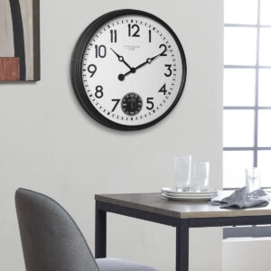The Terrace 29-inch Wall Clock offers a dapper, black resin frame with a crisp, contrasting, white face. Perfectly sized for a kitchen or living room, this timepiece will be the centerpiece of your room’s wall. The unique black subdial at the bottom of the face tracks the seconds for you, replacing the traditional second hand used on other clocks. Large Arabic numerals are easy to read from a distance. The accurate quartz movement, glass lens, and simple design make it perfect for a lobby or lunchroom as well. Requires two AA alkaline batteries (not included).