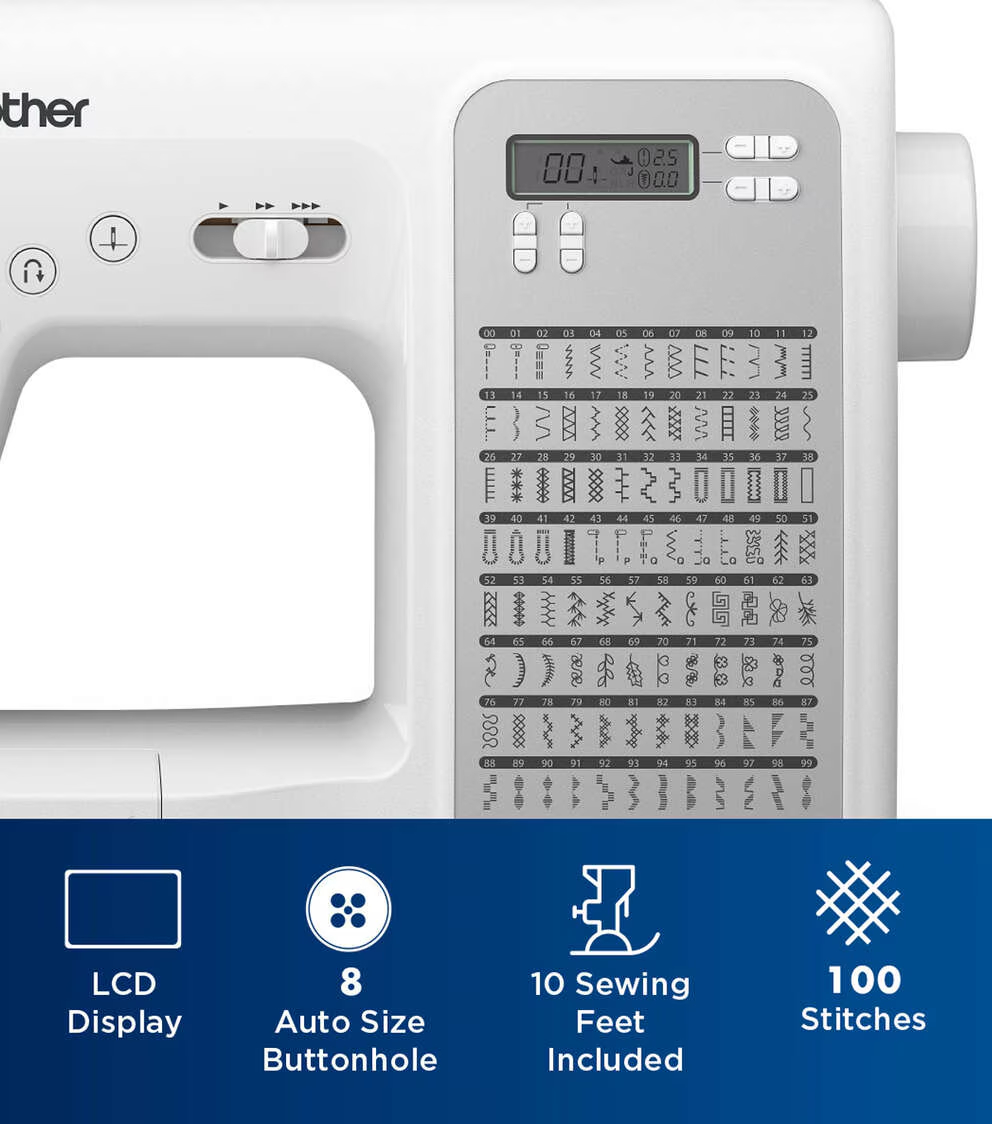 - 100 UNIQUE BUILT-IN STITCHES: The Brother CP100X sewing and quilting machine includes 100 built-in stitches including utility, decorative and heirloom stitch functions, and 8 auto-size buttonholes
