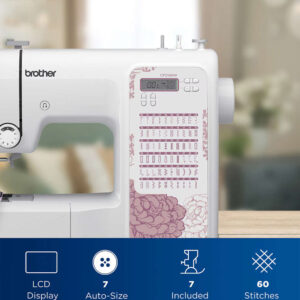 60 built-in stitches include built-in stitches, including utility, decorative, heirloom stitch functions, and 7 auto-size buttonholes.