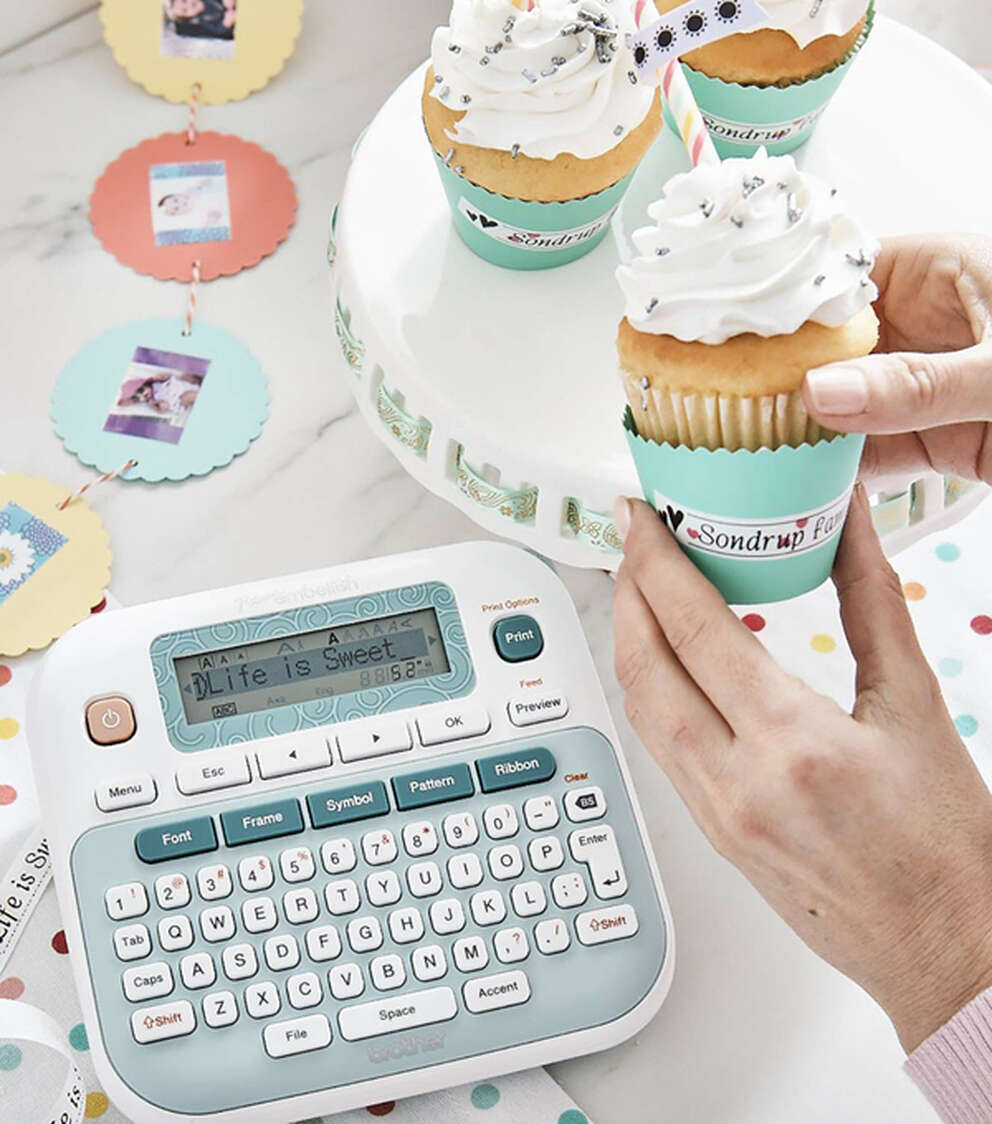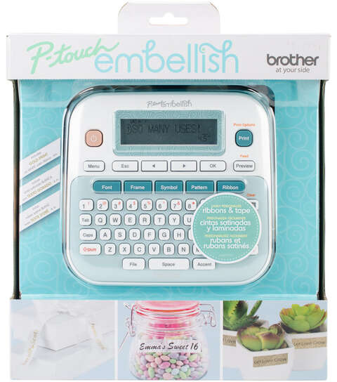 Personalize ribbons and tapes with the Brother P-touch Embellish Ribbon & Tape Printer. Choose from a wide range of fonts, borders, symbols and patterns to make your printed message look attractive. This tape and ribbon printer has easy-to-use, one-touch keys for quick formatting. Use the printed tape or ribbons to adorn your gift packages, scrapbooks, journals, albums, party invites and more. This kit includes one ribbon and tape printer with pre-designed templates, 14 fonts, 94 frames and over 400 plus symbols, 25 patterns, one touch keys for easy formatting, ribbon and one user’s guide. It requires six AAA Alkaline batteries or the Brother AC adapter, each sold separately.