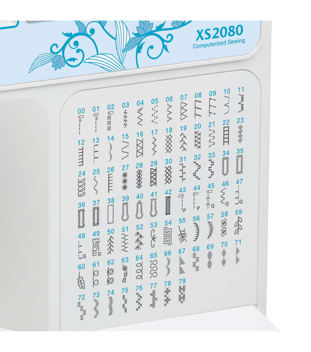 Enjoy every day sewing and mending with the XS2080. Featuring 80 unique built-in stitches, including 8 styles of 1-step buttonholes, this machine is easy to use, reliable and versatile. Including 7 accessory sewing and feet, including a buttonhole foot, overcasting foot, monogramming foot, zipper foot, zigzag foot, blind stitch foot, and button sewing foot. The XS2080 features a large, backlit LCD display for easy viewing, an advanced needle threading system, adjustable speed control, drop feed, and the Brother exclusive jam resistant, Quick-Set drop-in top bobbin.