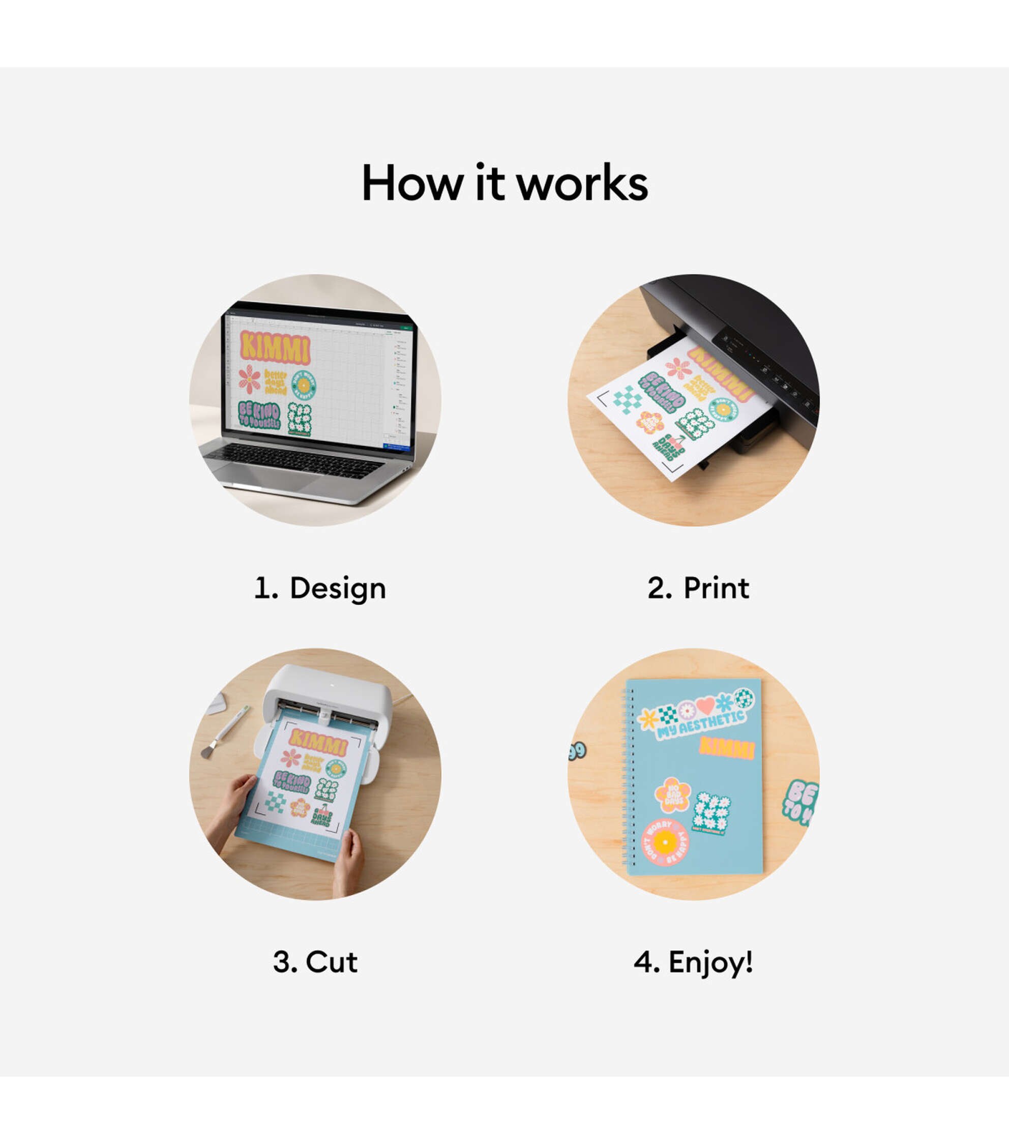 Personalize the world around you with Cricut Printable Sticker Paper. Made to simplify your sticker-making, this amazing material works with your home inkjet printer to print, then cut full-color sticker designs. Decorate notebooks, reward homework assignments, and make custom gift tags. Just create your design and print it, then your Cricut cutting machine automatically recognizes & precision-cuts the shapes for the custom stickers of your dreams. Features a thin liner to reduce printer jams. For best results, remove printer paper from printer tray. Then, load and print only one sheet of Cricut Sticker Paper at a time.