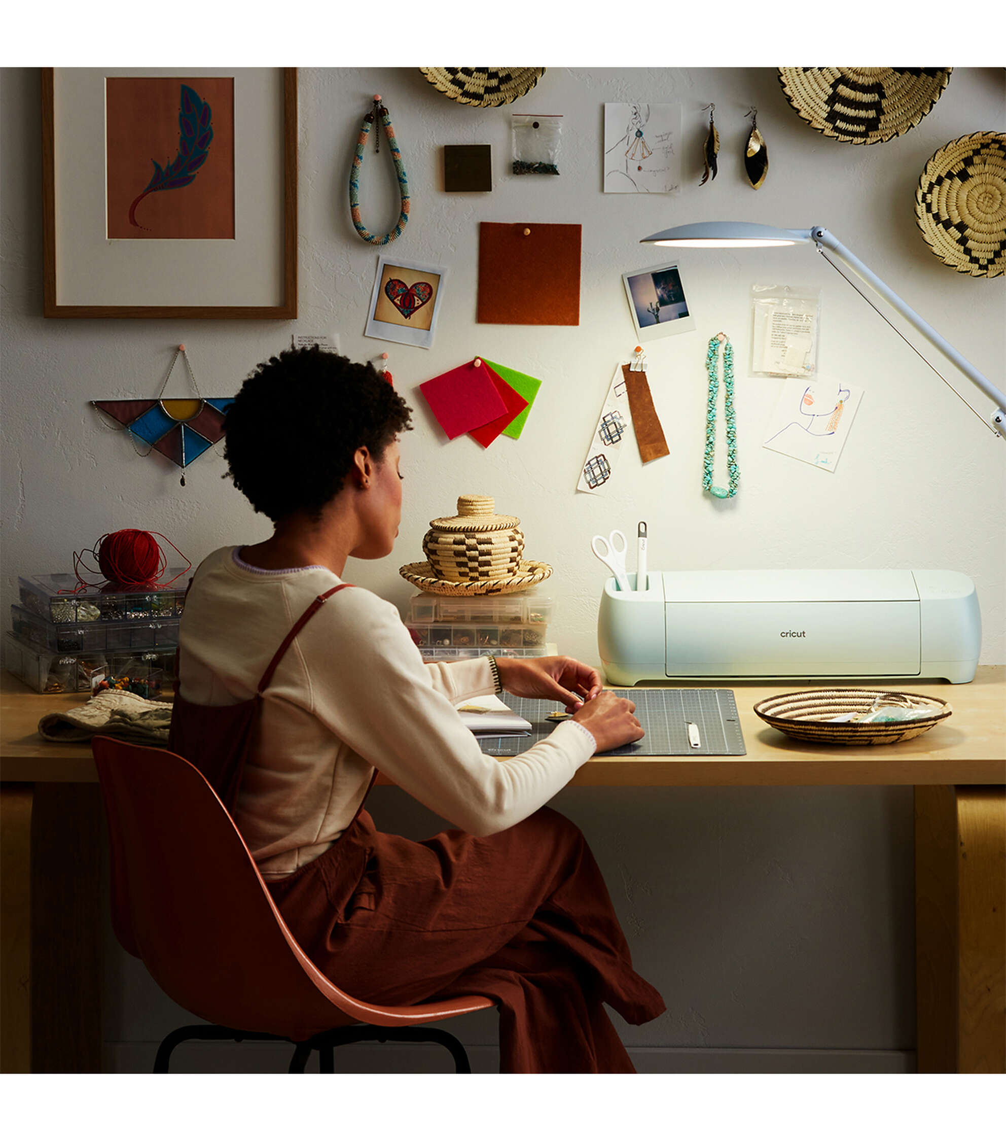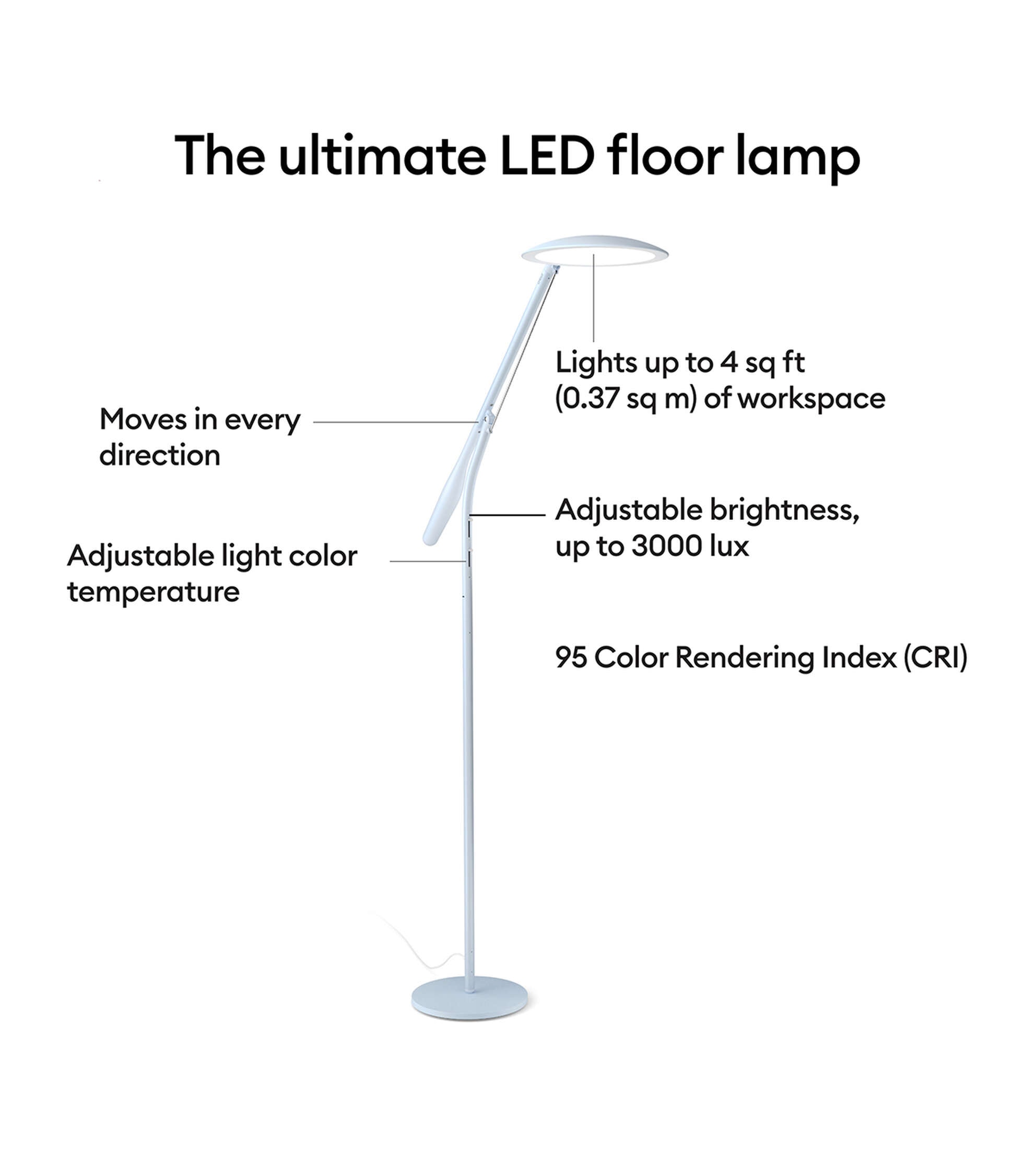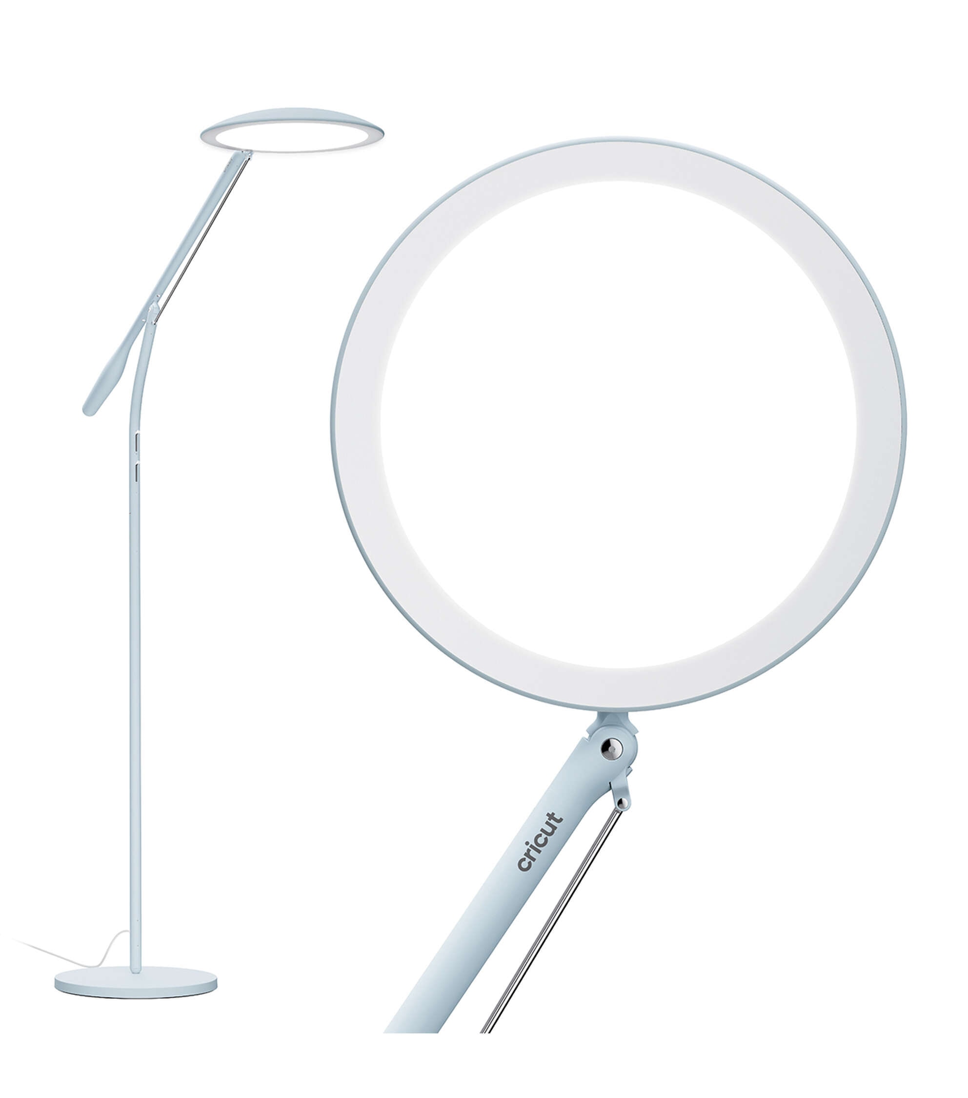 See your projects in a whole new light with Cricut Bright 360, the ultimate LED floor lamp. Its large, broad head evenly lights up your entire workspace. With a gentle push of the hand, the lamp pivots, rotates, and easily glides into the just-right position for every craft. Whether you’re working on a delicate accent piece or searching for the perfect matching shade, you’ll see colors and details with exceptional clarity. A high 95 CRI (Color Rendering Index) means your colors will appear more accurately than with a traditional bulb. Use the sleek sliders to adjust brightness (up to 3000 lux) as well as light color temperature (warm to cool white) to cast ideal light in any space. Comfortably see every detail with less glare, hotspots, and eye strain. From mid-craft to final project photos, Cricut Bright 360 shines light your way.