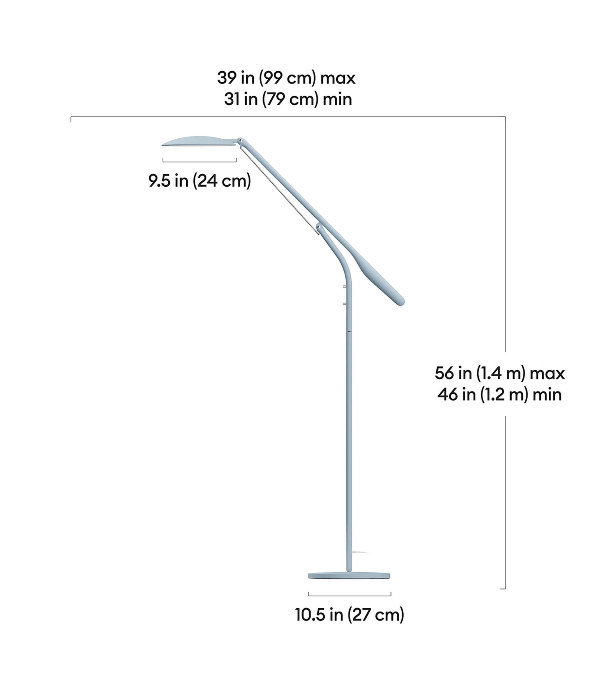 - Floor lamp dimensions: D: 10.5 in, W: 31 – 39 in, H: 46 – 56 in (D: 27 cm, W: 79 – 99 cm, H: 1.2 – 1.4 m)