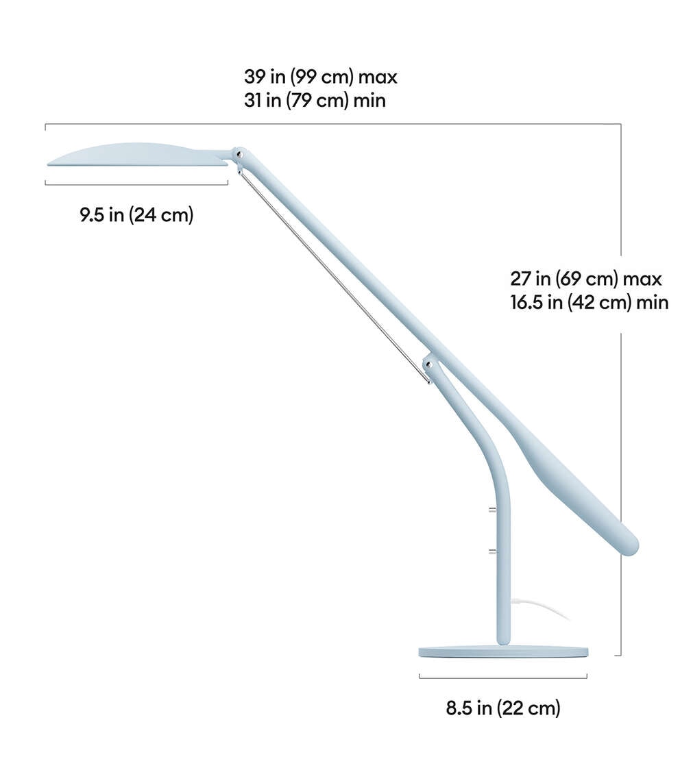 - Table lamp dimensions: D: 8.5 in, W: 31 – 39 in, H: 16.5 – 27 in (D: 22 cm, W: 79 – 99 cm, H: 42 – 69 cm)