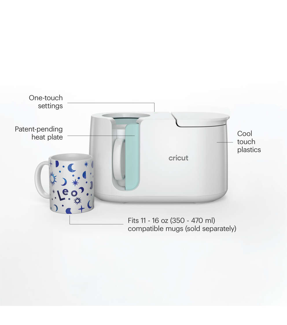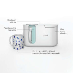 Make a mug masterpiece in minutes with Cricut Mug Press. Just create your design using Cricut Infusible Ink materials, attach it to your mug, and the press handles the rest! Personalize your Infusible Ink compatible mugs with unique art, a monogram, or whatever your heart desires. It’s got a patent-pending heat plate for excellent, consistent results and no manual temperature or pressure settings. Thoughtful safety features include auto-off. Perfect gifts for family, friends, teachers, neighbors, and coworkers have never been this easy. Optimized for Infusible Ink products and a perfect complement to any Cricut cutting machine. Carefully follow instructions at cricut.com/make-mugs. Adult use only. Use in well-ventilated area. Vapor emitted during heat transfer. See cricut.com/help/infusible-ink-warning For use with Infusible Ink compatible mugs, 11 – 16 oz (350 – 470 ml) straight wall only; 82-86 mm diameter mugs +/- 1 mm (3.2-3.4 in) For use with compatible sublimation mug blanks, polymer coated, 11 – 16 oz (350 – 470 ml) straight wall only; 82-86 mm diameter mugs +/- 1 mm (3.2-3.4 in)