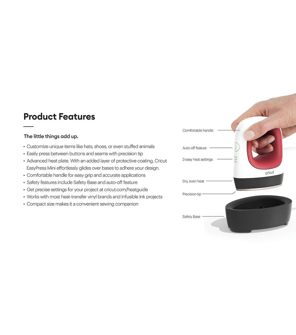 Bring on the ususual objects and improbable projects. Now you can get professional heat-transfer results with Cricut EasyPress Mini! Whether it’s a shapely object or an extra-small and unique project, including baby shoes, hats, stuffed animals, and more, you’ll have what it takes to make a successful heat transfer. The design is compact and thoughtful, so you can easily curve with contours, get between buttons, and even squeeze into seams. Three heat settings are all you need for every heat-transfer project, including Infusible Ink transfers when used on a compatible blank. An insulated base and an auto-shutoff feature are safety features you’ll love. Plus it’s lightweight, portable, and easy to store. Works with major brands of HTV, iron-on, and the entire Infusible Ink family of products. It’s a perfect complement to any Cricut cutting machine.