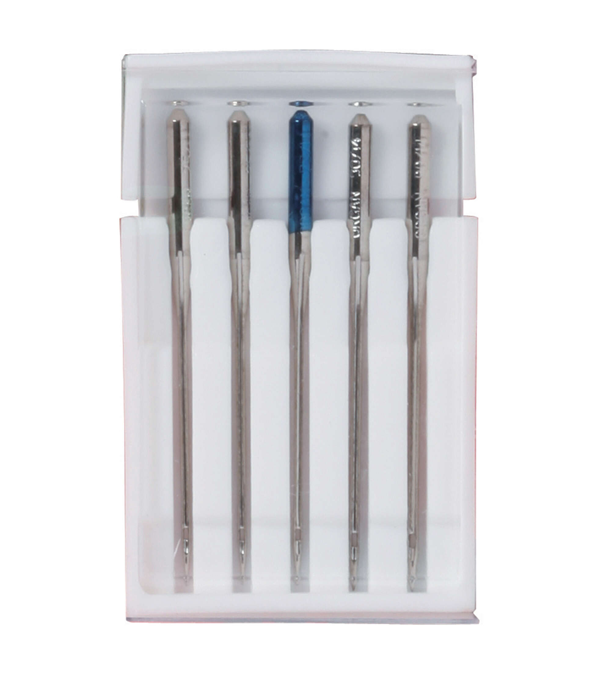- Set contains one blue tip needle for difficult fabrics, two large needles for thick fabrics, and two small needles for fine fabrics