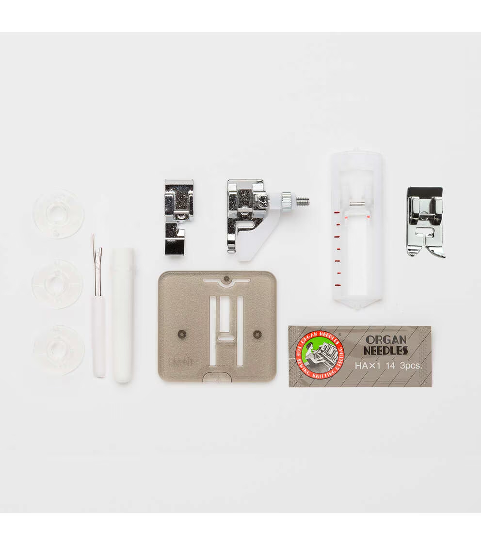 - Standard Accessories: Bobbins, Needles, Seam Ripper, Darning Plate, Quick Start Guide, Instruction Manual