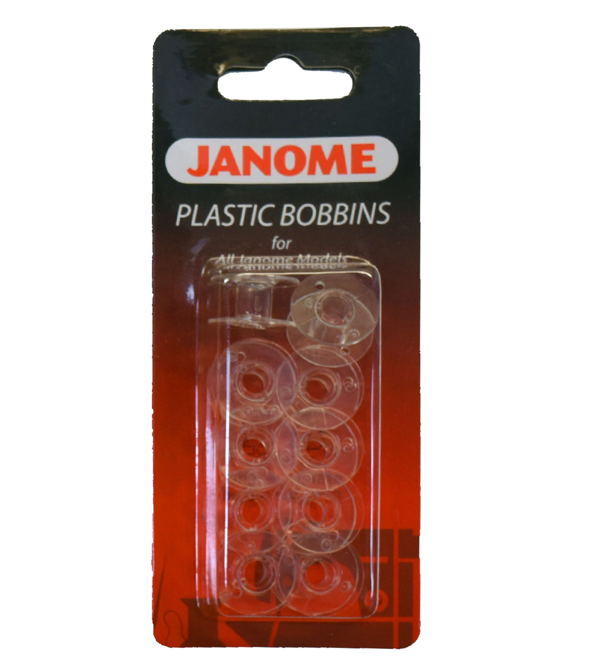 Janome has specially made bobbins that perform best in our machines. There is a patented recipe involving rubber added to the clear resin which improves performance and reduces noise. Imprinted with the letter J.