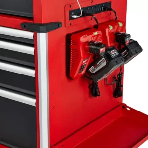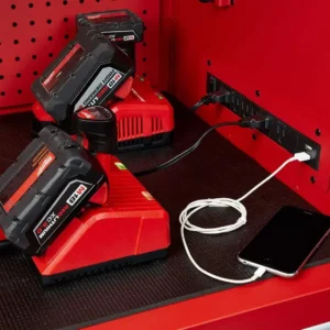 Some of the cool features that this cabinet comes with are two 120-v plug strips with USB ports so you can charge batteries, plug in lights, stereos or anything else you’re heart desires. One of these strips is located on the top shelf of the cabinet, the other is on the outside about knee-height from the ground. Also, in true Milwaukee fashion, there are spots near the outer strip to hang your Milwaukee battery chargers from so they can stay plugged in and always ready to charge batteries from.