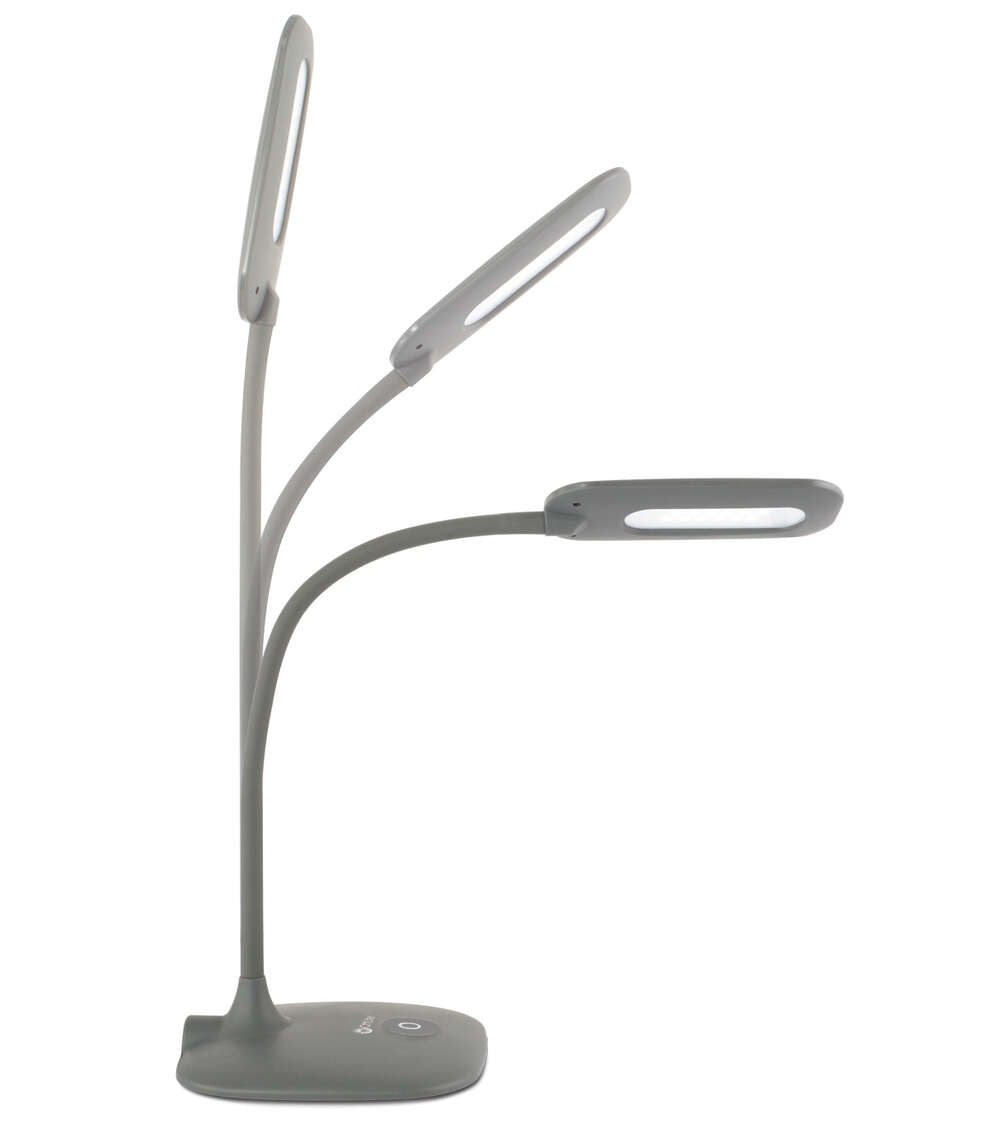 - The grey OttLite Flexible Soft Touch LED Desk Lamp is perfect for your crafting table, desk or dorm room. With a 6.25″ shade that extends over your work area and a flexible, rubberized neck, you can direct light wherever you need it most. The 3 brightness setting are touch-activated and the soft touch finish fits any décor. With OttLite Natural Dayight LED Illumination, you can see details clearly and reduce glare & eyestrain so you can do what you love, longer. NOTE: This item is designed only for American 110V/120V (Single Voltage) and may require a power adapter or voltage transformer to work in countries outside of USA & Canada.