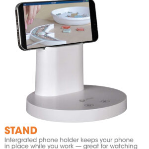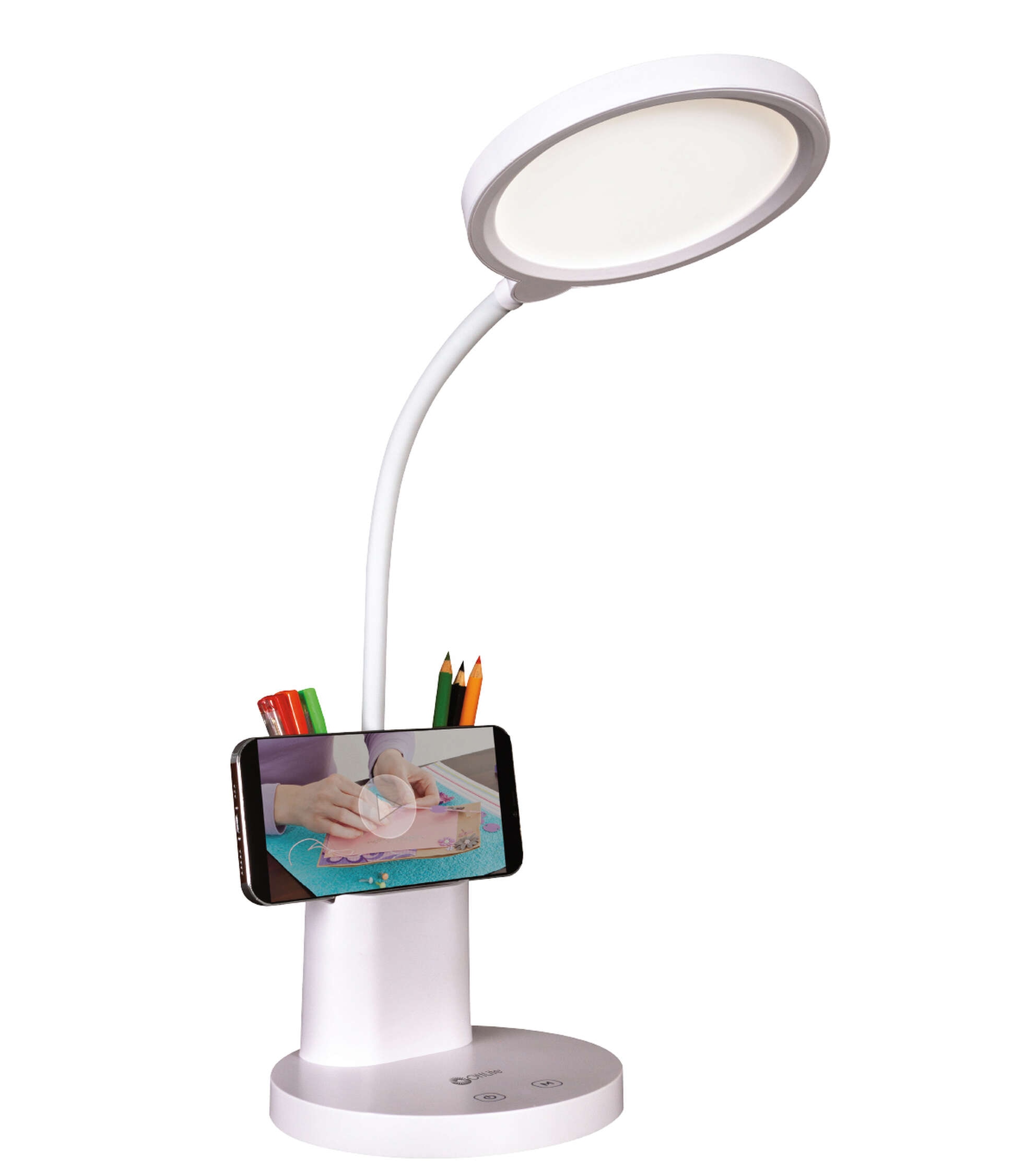 Easily move the OttLite Rechargeable LED Lamp with Phone Holder from coffee table to dining room table to craft room – wherever your creativity takes you! This rechargeable lamp is equipped with a lithium-ion battery. Just charge with the provided USB charging cable and you’re ready to move. See every detail clearly and color accurately with OttLite’s exclusive ClearSun LEDs – shown to reduce eyestrain by up to 51%. Position the natural daylight illumination over your work area with the flexible neck and wide 5.375 inch diameter shade. Store key supplies in the base or use the base as a mobile phone stand – great for watching videos.