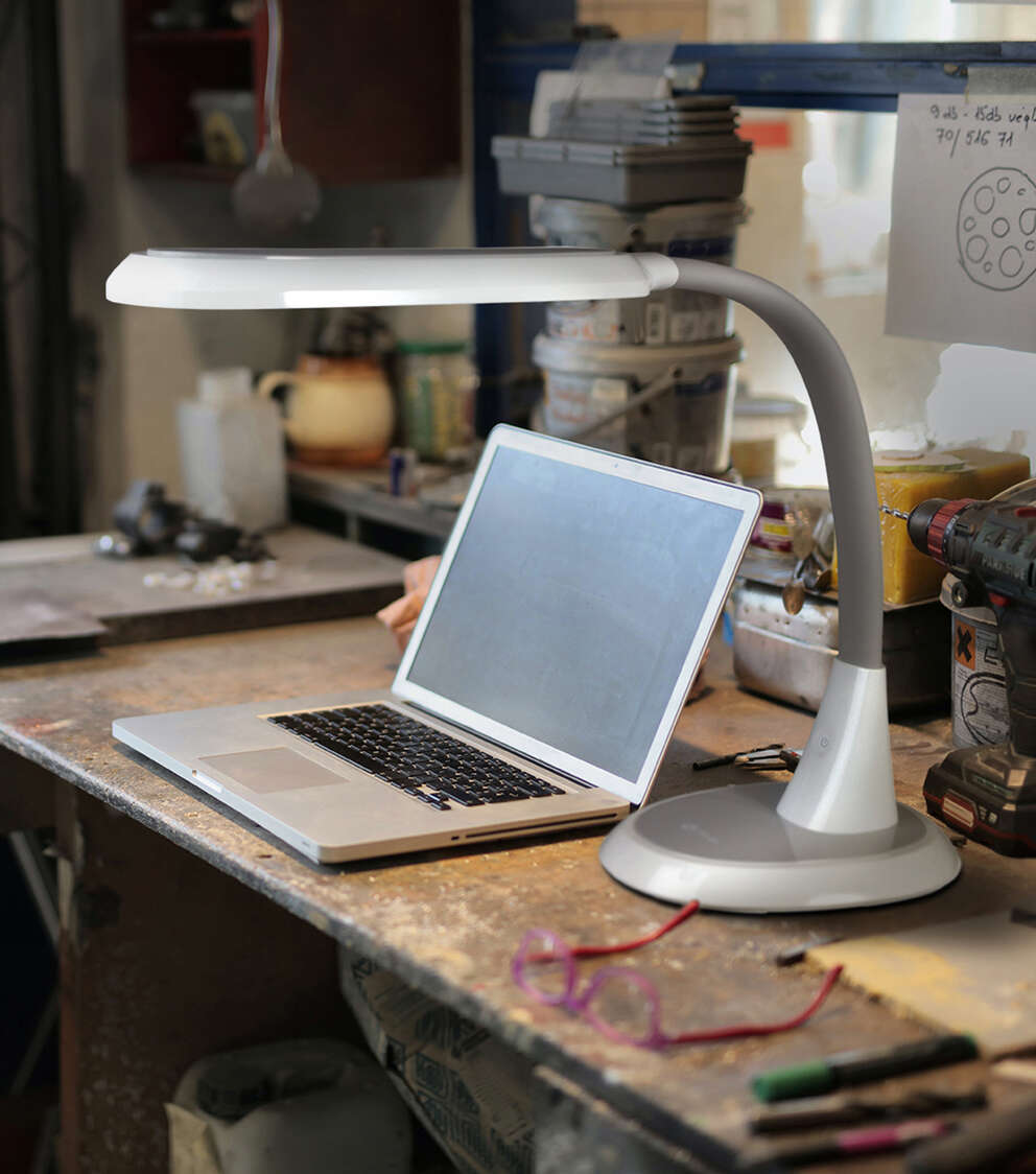 Perfect for large workspaces and big projects, the OttLiteLite Wide Area Dimmable LED Table Lamp delivers expansive ClearSun LED illumination that shows colors true to life and helps reduce eyestrain for hours of visual comfort. The wide shade measures 12 x 4 inches with three brightness levels to deliver just the right amount of OttLiteLite’s ClearSun illumination for your space. Use at full height of 27 inches to cover a large area; or bend the flexible neck down to 12 inches for focused, concentrated light, great for tracing, jewelry making and detail work. OttLiteLite allows you to see details clearly and colors accurately, helping you do what you love, longer.