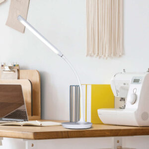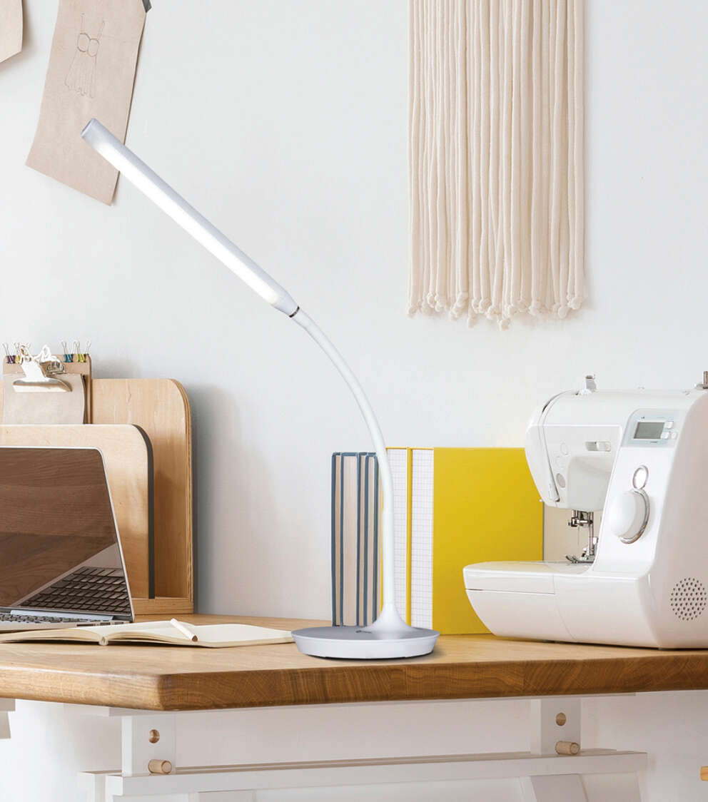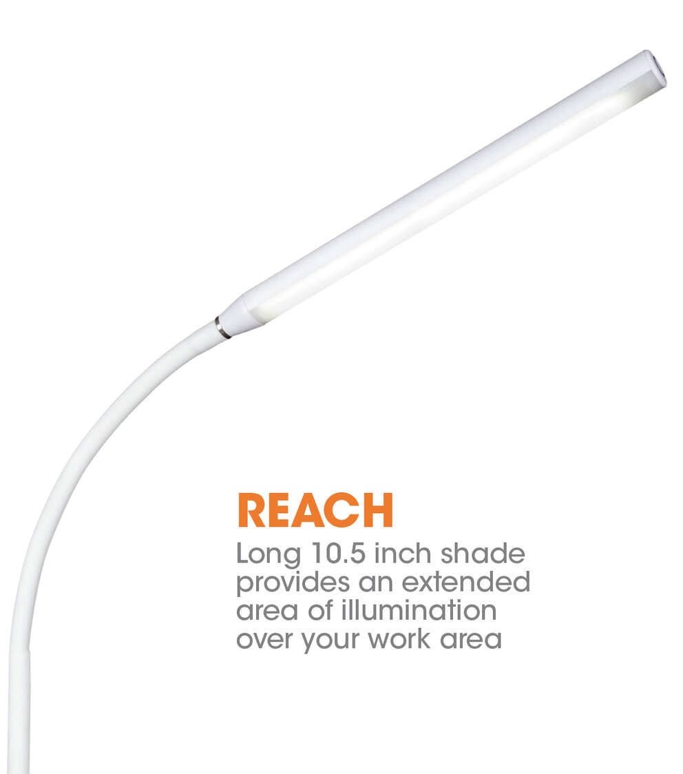 Great for projects large and small, the OttLite Extended Reach LED Desk Lamp features a 10.5 inch shade and super flexible neck that holds position over your work area and lets you easily adjust as you work. With OttLite’s exclusive ClearSun natural daylight LED technology, you’ll see every detail clearly and color accurately. OttLite ClearSun LEDs have a Color Rendering Index of 95+ so you can make color decisions with total confidence. With the touch activated controls, choose from three brightness levels to shine just the right amount of light over your project. With OttLite you’ll see every color accurately and detail clearly with reduced glare and eyestrain so you can do what you love, longer.