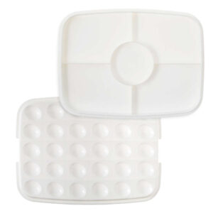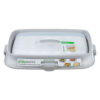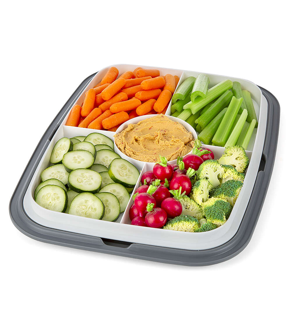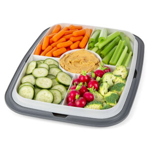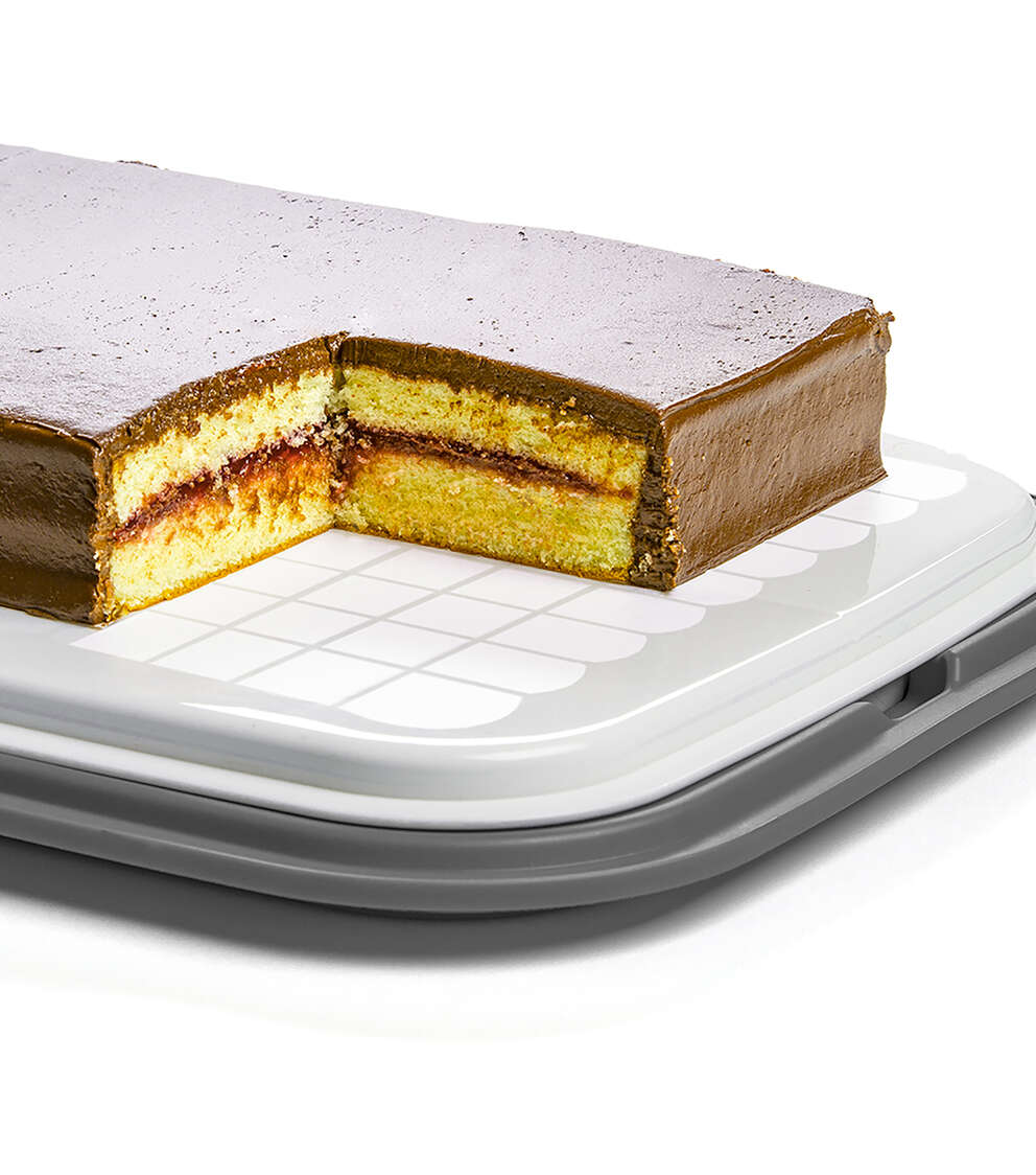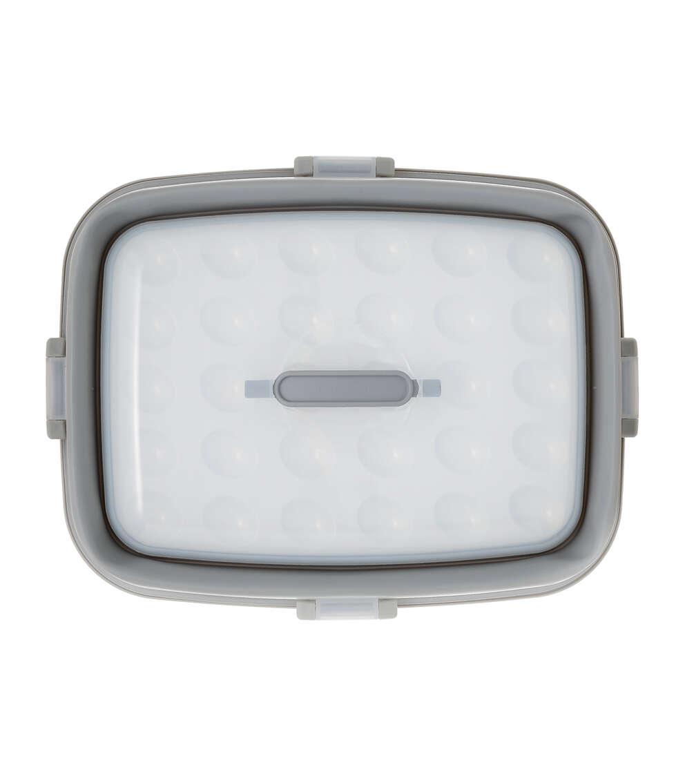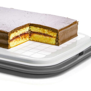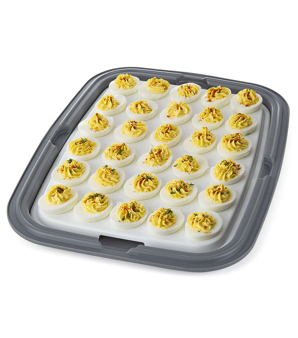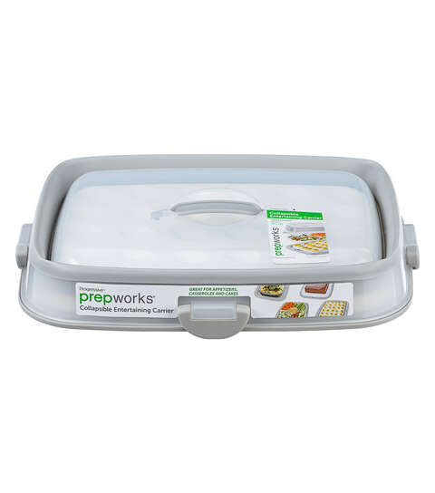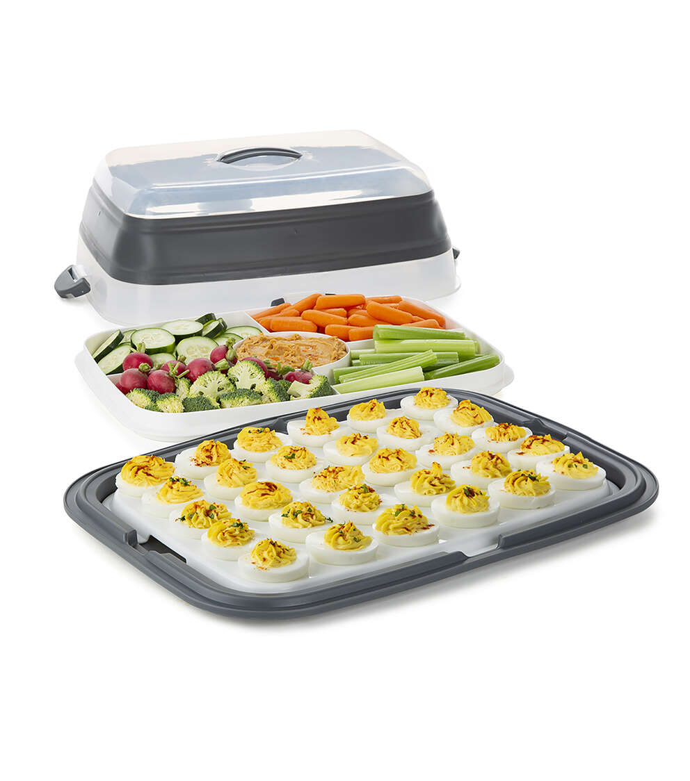 Transport cakes, appetizers & more with this versatile carrier. The flat side of insert is perfect for transporting a 9 by 13 sheet cake and features a built in slicing guide. COLLAPSIBLE and DURABLE. This dishwasher safe carrier includes 2 trays: a reversable divided appetizer or cake tray and a deviled egg tray. Tray nests inside carrier lid which collapses to half its original height. Collapse to store, expand to use.