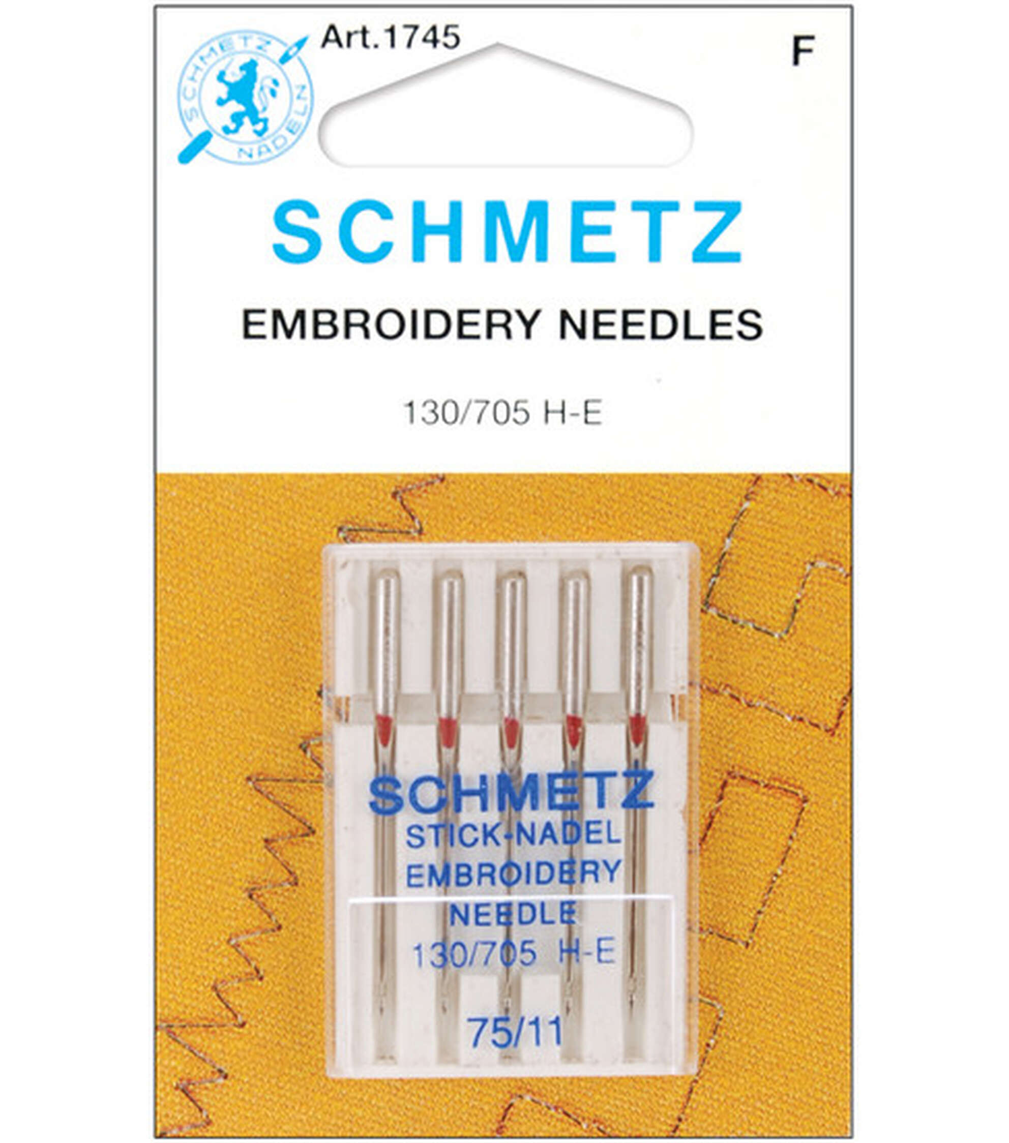 Use the Schmetz Embroidery Machine Needles to enhance your sewing experience. Designed with an exclusive scarf, needle back and wide eye, these needles help in shielding delicate threads. They also allow hassle-free embroidery by eliminating excess friction. You can use these embroidery needles with polyester, rayon and specialized embroidery threads. The pack includes five size 75/11 embroidery machine needles.