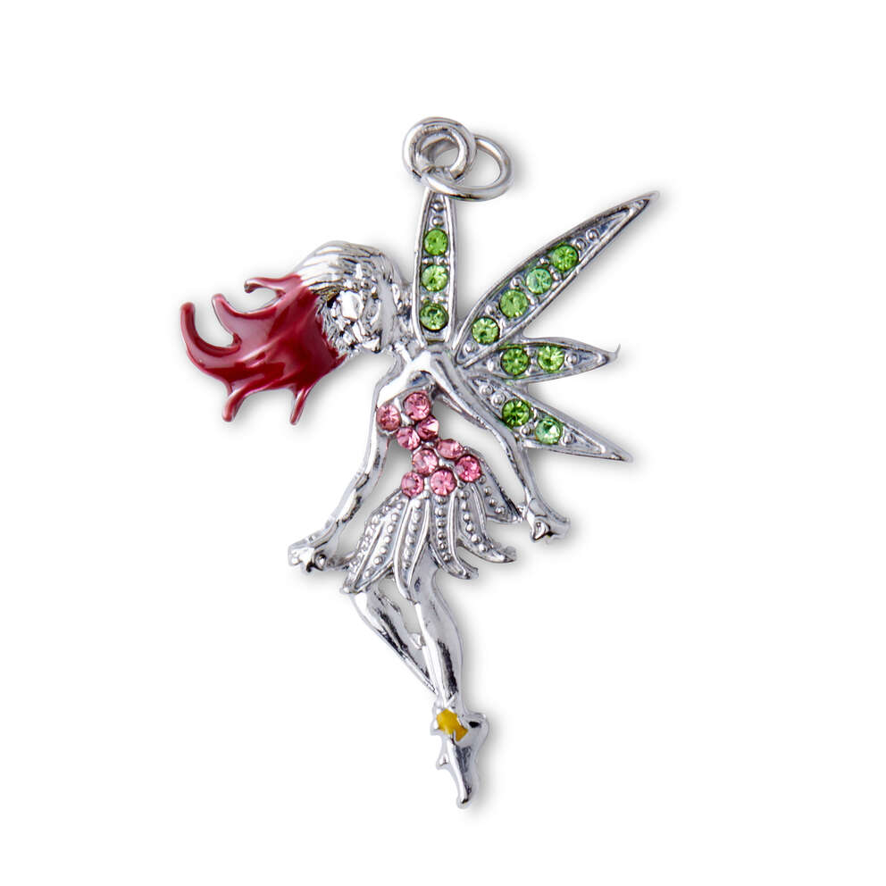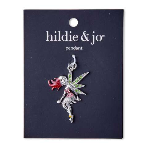 Crafted in the shape of a fairy, the hildie & jo Silver Fairy Wings Pendant-Pink & Green Crystals will look lovely on a bracelet, necklace, key chain, or other DIY jewelry design. Made of enamel, glass and zinc alloy, this fairy pendant has pink hair, green crystals in the silver wings, and pink crystals on the top of the dress.