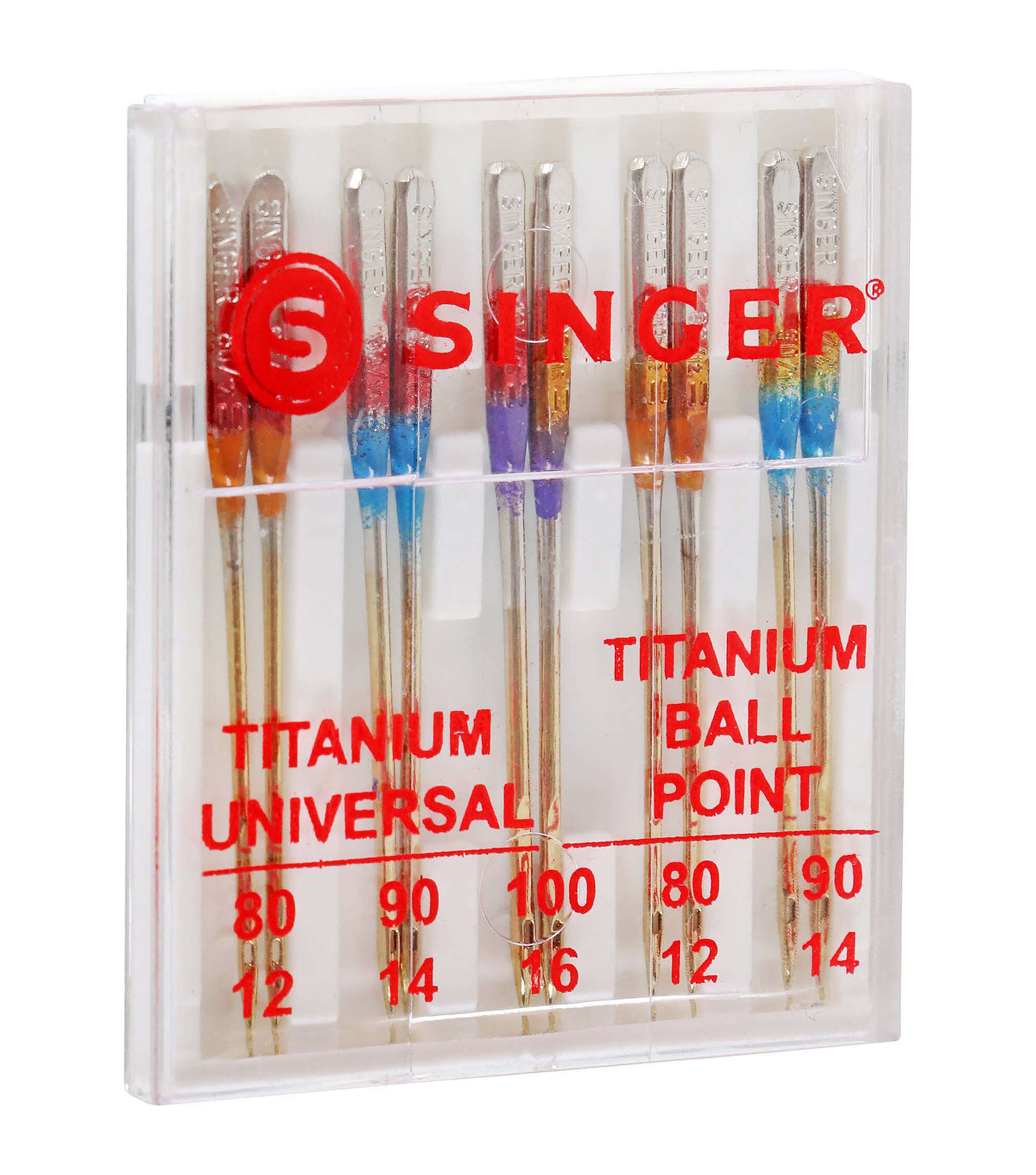 - The SINGER Universal Regular & Ball Point Titanium Sewing Machine Needles are an excellent addition to a sewing enthusiast’s collection, lasting up to 2 times longer than traditional steel needles. Ball point needles are best used on knit fabrics, and regular point needles work best on woven fabrics. Titanium makes them all extra strong and durable. Needles are color coded to reflect the needle type and sizes, which include: 2 orange size 80/12 to use on lightweight fabrics, 2 blue size 90/14 to use on medium weight fabrics, and 1 purple size 100/16 to use on heavyweight fabrics in both universal and ball point machine needles. The 10 machine needles come in a convenient plastic transparent case with individual storage slots and sizes marked on the clear cover. The SINGER titanium sewing machine needles can be used on SINGER, Brother, Kenmore, Janome, Juki, Bernina and other quality household domestic sewing machines. Domestic machine needles are not compatible with industrial sewing machines.