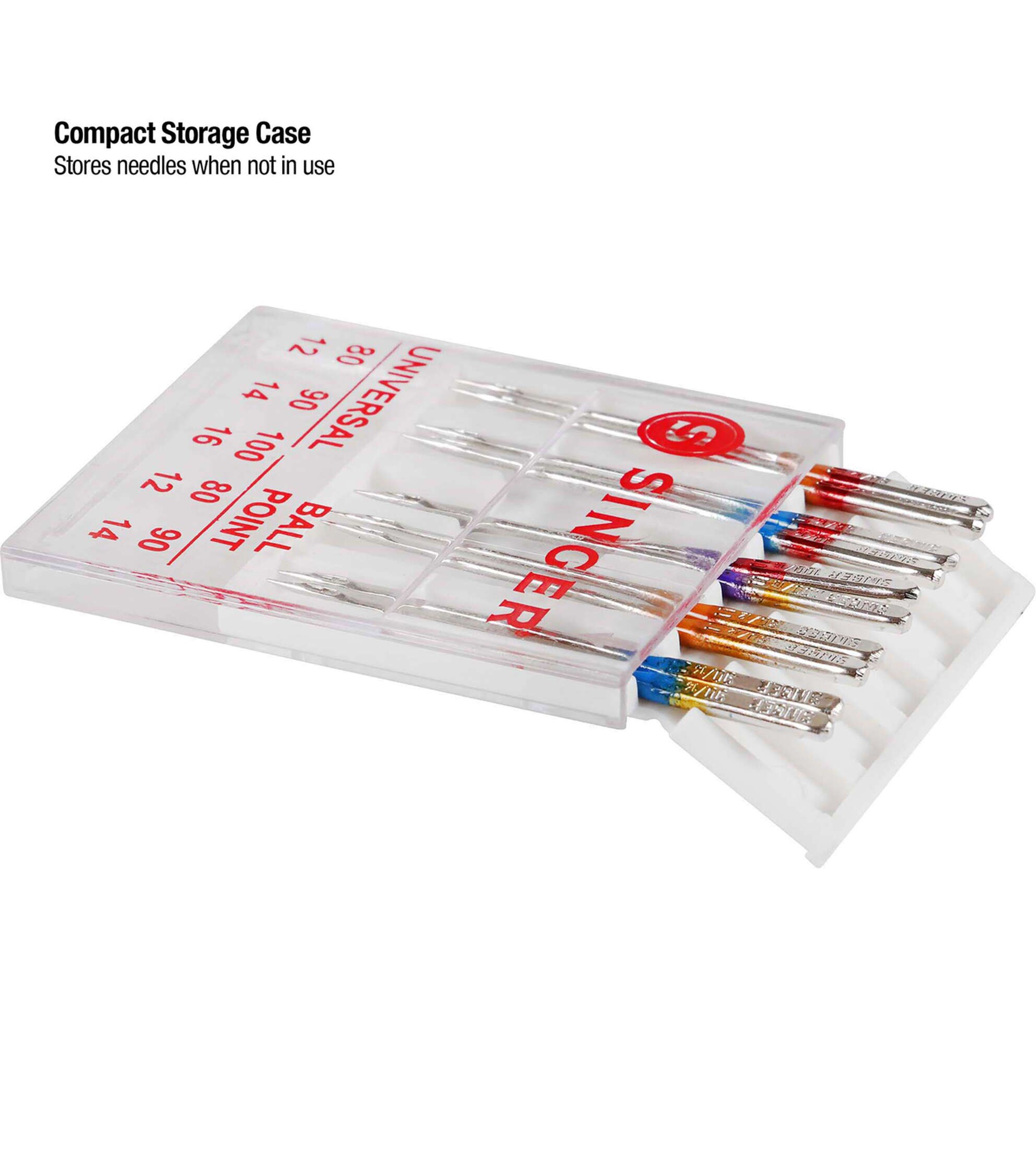 - To prevent needles from going dull when not in use, store needles in the compact transparent case which includes size marking on its cover