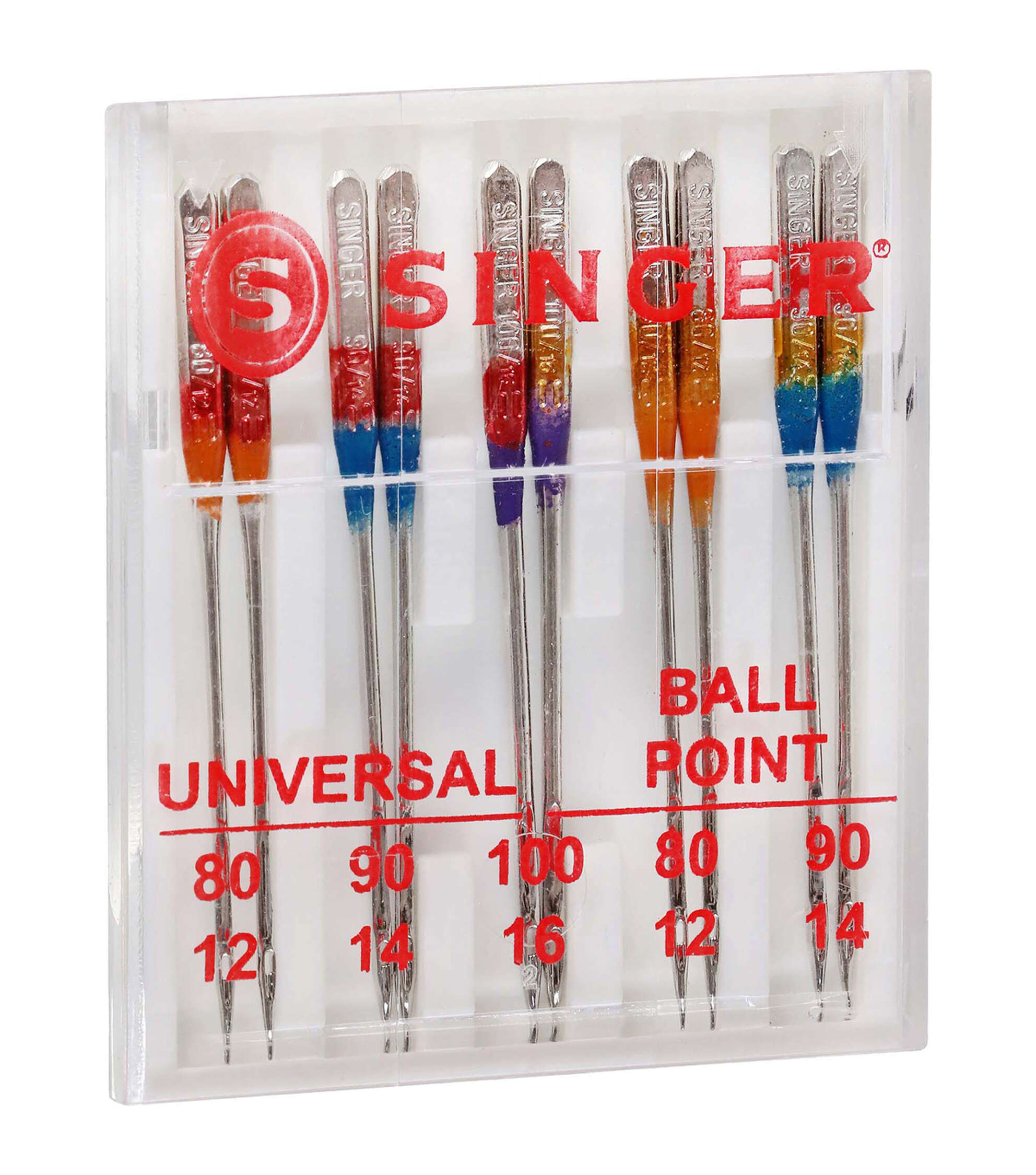 - The pack of 10 SINGER Regular and Ball point Sewing Machine Needles is a great starter kit offering the beginner sewing enthusiast two standard types of needles in varied sizes. Ball point needles are best used on knit fabrics, and regular point needles work best on woven fabrics. Machine needles are color coded to their sizes, which include: 2 orange size 80/12 to use on lightweight fabrics, 2 blue size 90/14 to use on medium weight fabrics, and 1 purple size 100/16 to use on heavyweight fabrics in both universal and ball point machine needles. The 10 machine needles come in a convenient plastic transparent case with individual storage slots and sizes marked on the clear cover. SINGER sewing machine needles can be used on SINGER, Brother, Kenmore, Bernina, Janome, Juki and other quality household domestic sewing machines. Dometic machines needles are not compatible with industry sewing machines.
