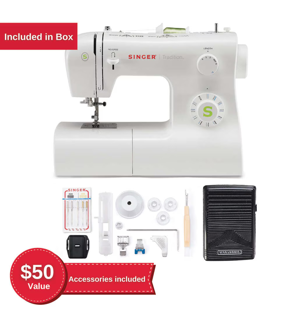 From mending and everyday sewing to crafts and simple home decor, the SINGER Tradition 2277 is the perfect sewing machine for a busy and creative sewist on-the-go. With almost one hundred Stitch Applications, you can easily customize projects with basic, decorative, and stretch stitches. The adjustable stitch length and width functions offer further stitch customization. Plus, you can create buttonholes in one easy step!The Tradition 2277 sewing machine also includes four accessory feet to ensure a great start on your sewing journey! One of the included presser feet is the SINGER Button Sewing Foot which makes sewing on a button a breeze! SINGER includes everything you need to make your sewing easy and fun. The Tradition 2277 sewing machine offers many other ease-of-use features like the super simple built-in Needle Threader, removable free arm for smaller projects, and easy stitch selection. Whether you want to sew a dress, stitch a pillow, or create a tote, you will see how the Tradition 2277 sewing machine was designed with you and your projects in mind!