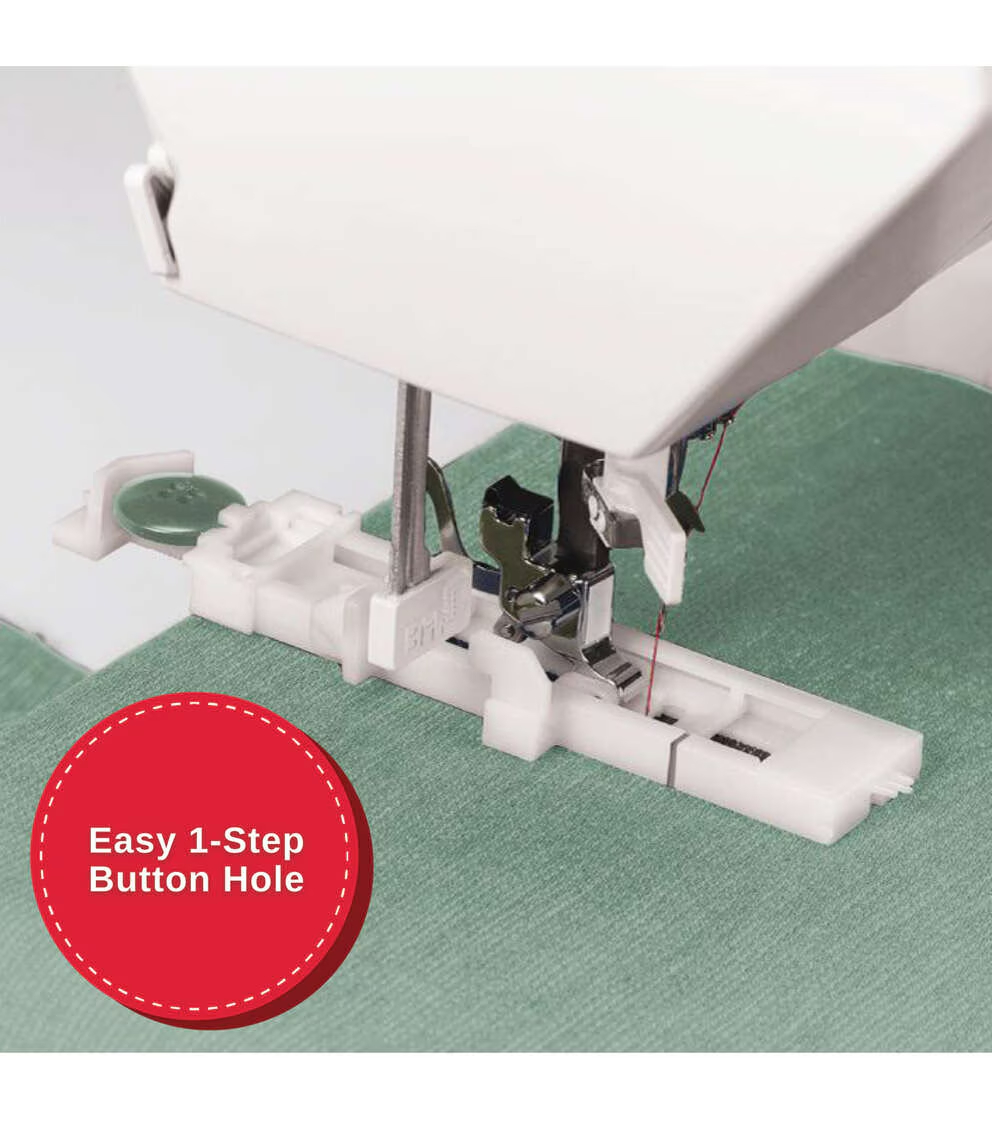 - Automatic One-Step Buttonhole – Just place the button in the buttonhole foot and the machine sews a buttonhole perfectly sized for that button, delivering consistent results every time.