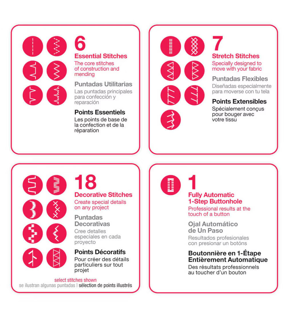 - 110 Stitch Applications- Enjoy a wide range of sewing techniques for creativity and customization. Choose basic, stretch and decorative stitches, as well as a one-step buttonhole.