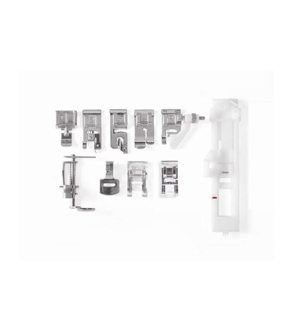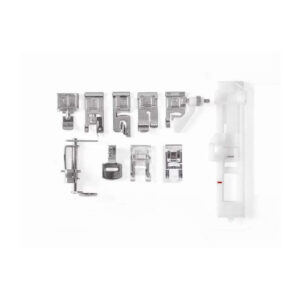 - Includes All-Purpose Foot (on machine), Zipper Foot, Buttonhole Foot, Blind Hem Foot, Satin Stitch Foot, Overcasting Foot, Darning & Embroidery Foot, Gathering Foot, Rolled Hem Foot, Quarter Inch Foot. Pack of Needles, Bobbins (Class 15J), Thread Spool Caps, Auxiliary Spool Pin, Spool Pin Felt, Darning Plate, Needle Plate Screwdriver, Seam Ripper / Lint Brush, Soft-Sided Dust Cover, Foot Pedal, Power Cord, Instruction Manual (English, Spanish, French), Machine Intro DVD