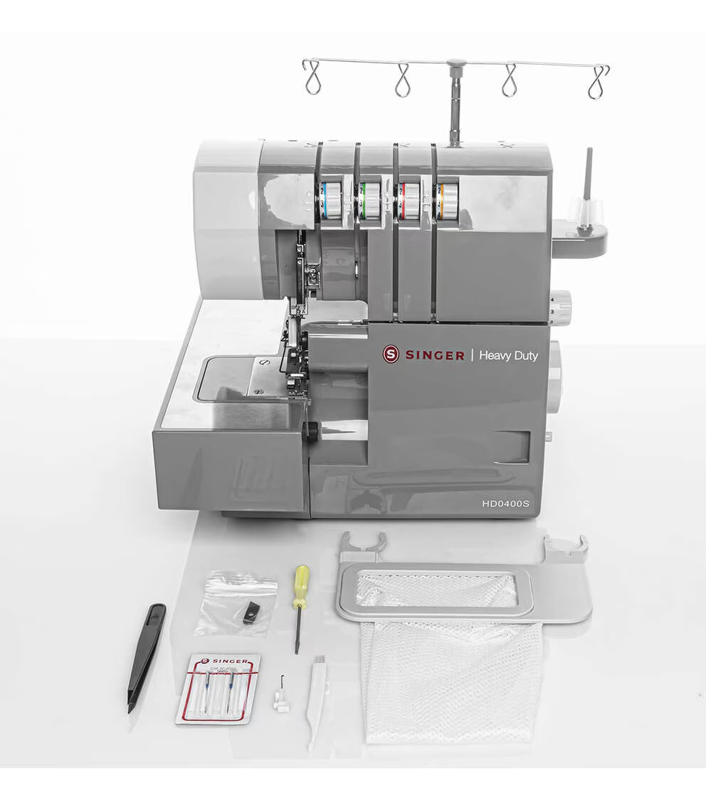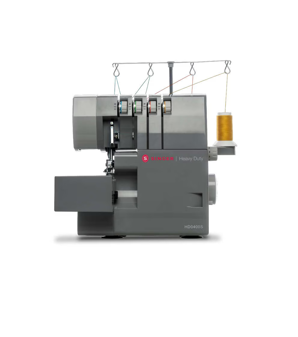 The SINGER HD0400S Serger saves you time because it sews a seam and seam finish at the same time while trimming away any excess seam allowance. This Serger features a heavy duty metal frame, a stainless steel bedplate, 60% larger cutting knife, 2/3/4 thread capacity, free arm, differential feed, 1300 stitches-per-minute (SPM), adjustable thread tension, built-in rolled hem plate, pre-threaded color coded spools, extra high presser foot lift, 2 LED lights, quick and easy threading, and includes an All Purpose Presser Foot.