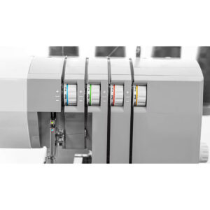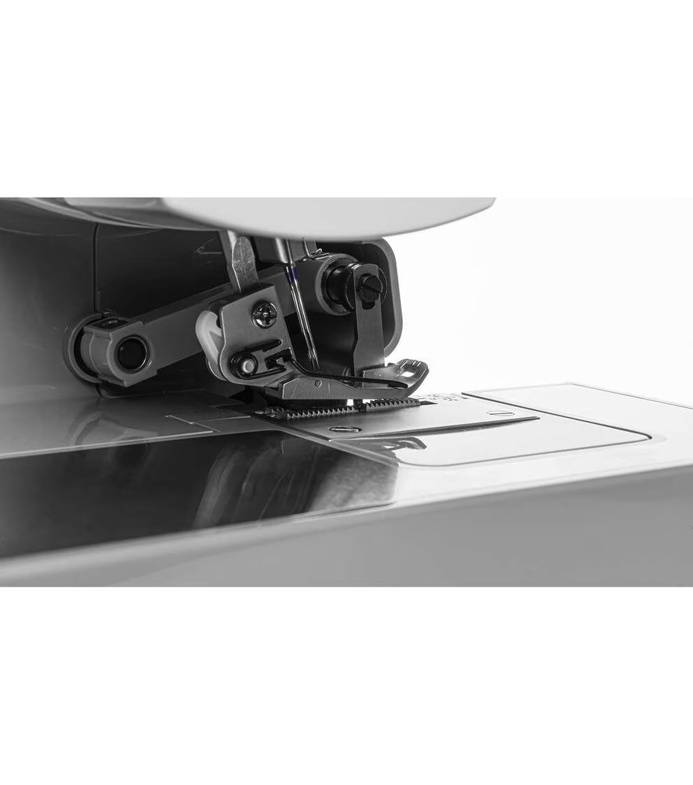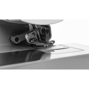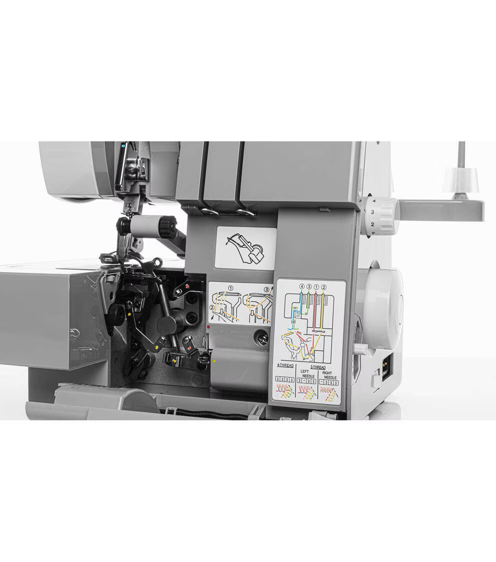 The upper knife can be engaged to trim excess seam allowance as you sew, or it can be rolled out of the way for special techniques like flatlocking.