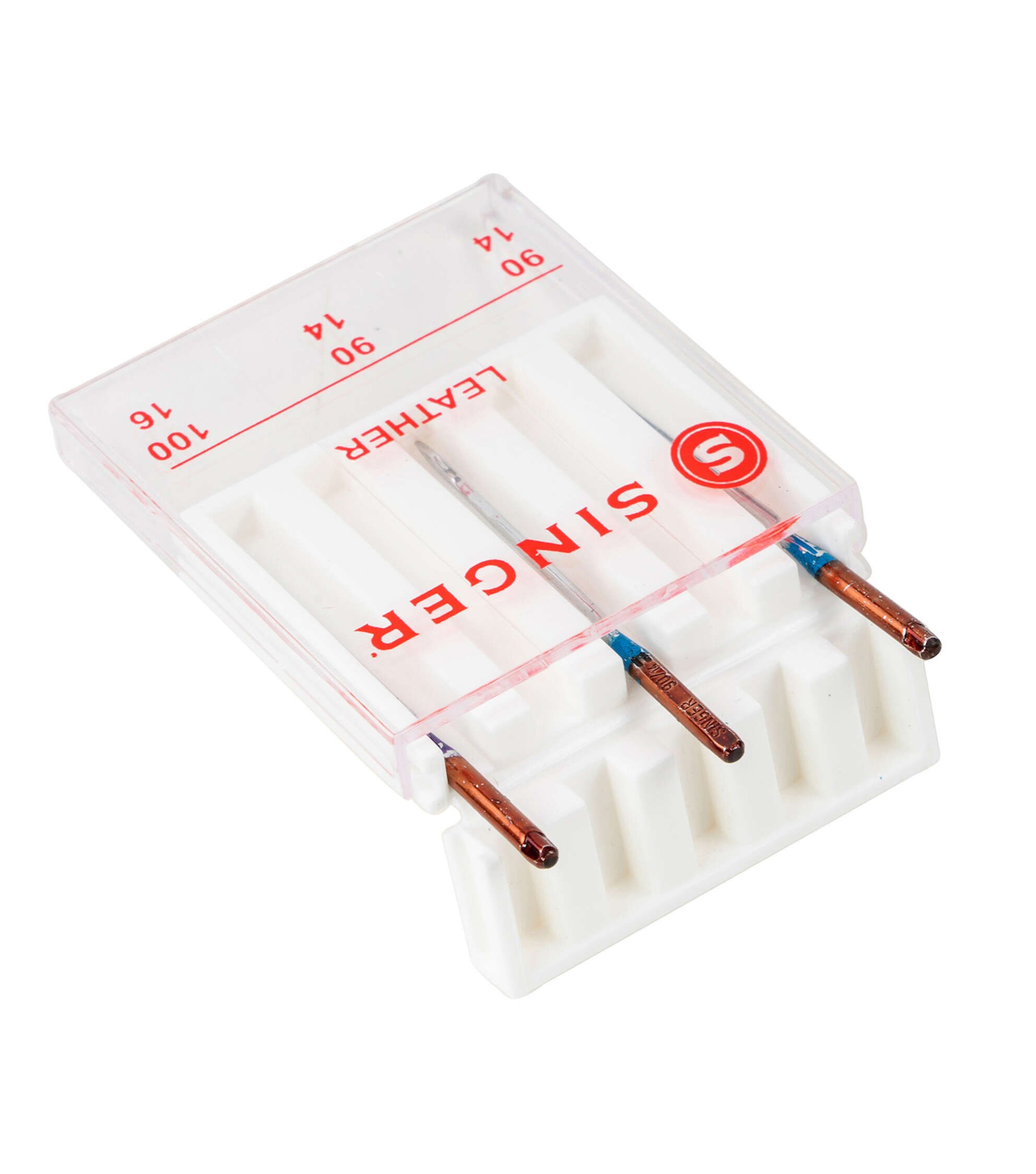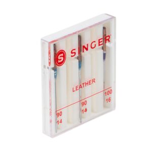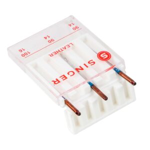 Use the Singer Assorted Leather Machine Needles for sewing leather and other heavyweight fabrics. This pack includes three leather needles, two sized 90/14 and one sized 100/16, that are encased in a compact storage case with the sizing marked on its clear cover. These needles are designed for use with Singer, Brother, Kenmore and other quality sewing machines.