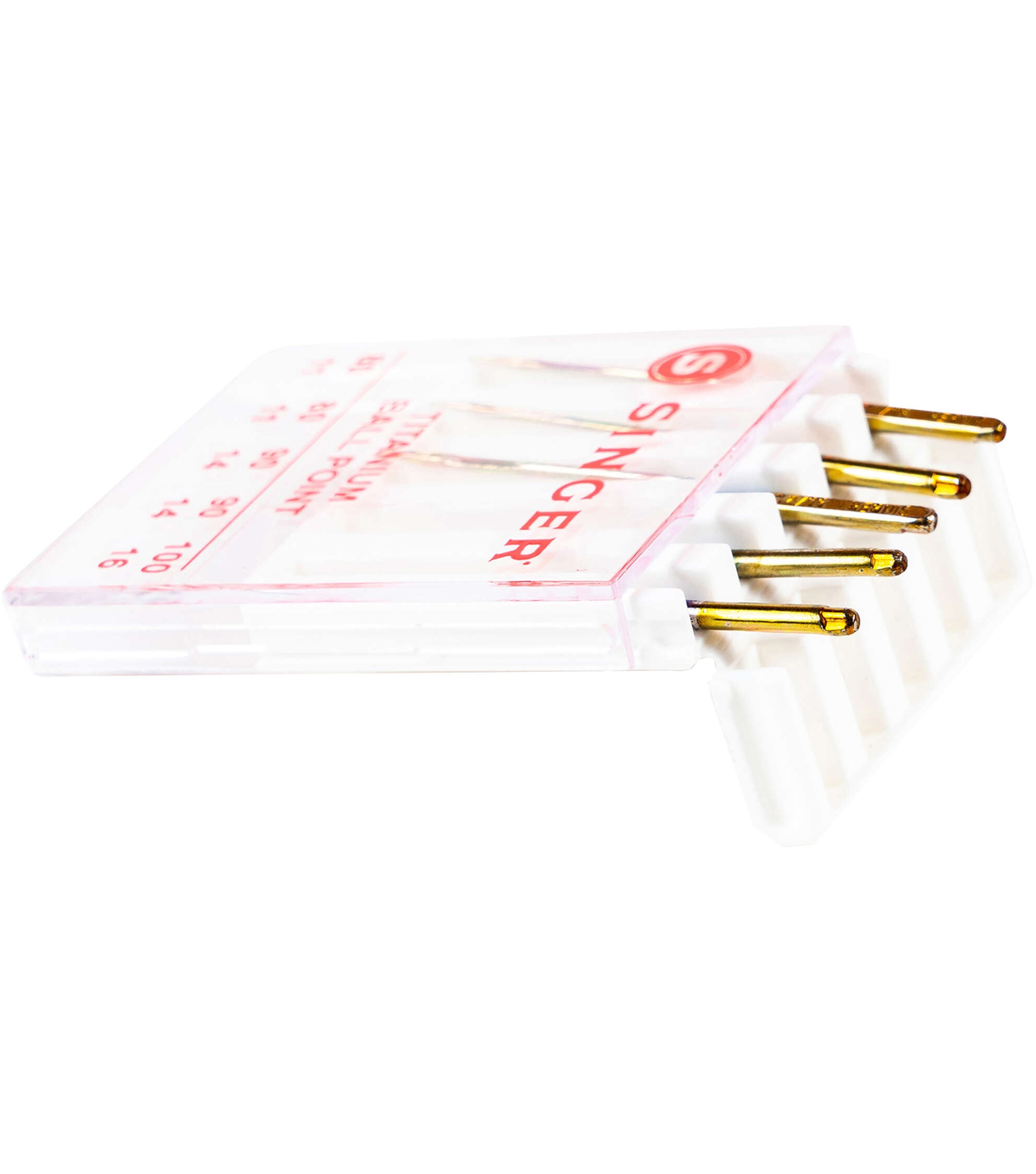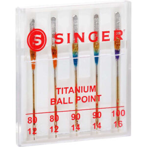 The Singer Titanium Assorted Universal Ball Point Machine Needles will come in handy when working on knit fabric projects. This pack includes two needles in size 80/11, two needles in size 90/14 and one needle in size 11/16. These needles are made of titanium, which helps avoid thread breakage even at high speeds. They are designed to fit Singer, Brother, Kenmore and other quality sewing machines. Each of these needles is color-coded for easy identification of the needle size.