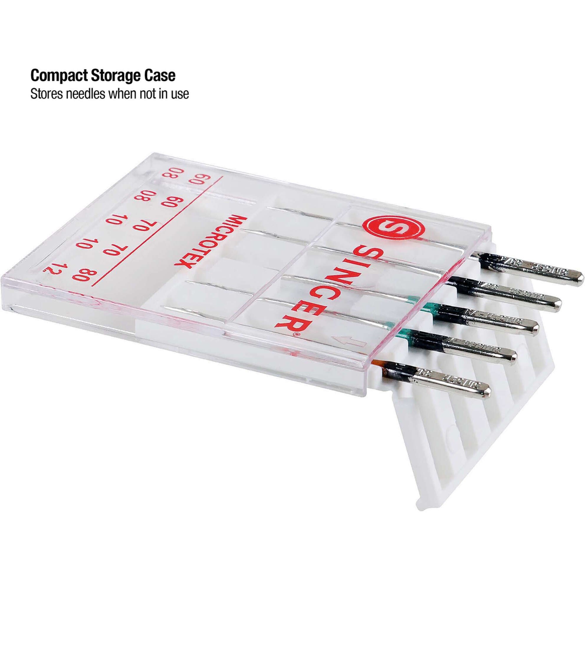 Get perfectly straight stiches in your sewing projects with the Singer Assorted Universal Microtex Sewing Machine Needles. This set of five multi-sized machine needles are designed with thin, sharp points. These needles come in three sizes of 70/09 that can be used on sheer, lightweight fabrics, 60/08 that are ideal to be used on lightweight fabrics and 80/11 that are perfect to be used on silk and other lightweight woven fabrics. They can be used with Singer, Brother, Kenmore and other quality sewing machines. The needles come in a thin, durable case with needle sizing marked on the clear cover.