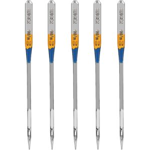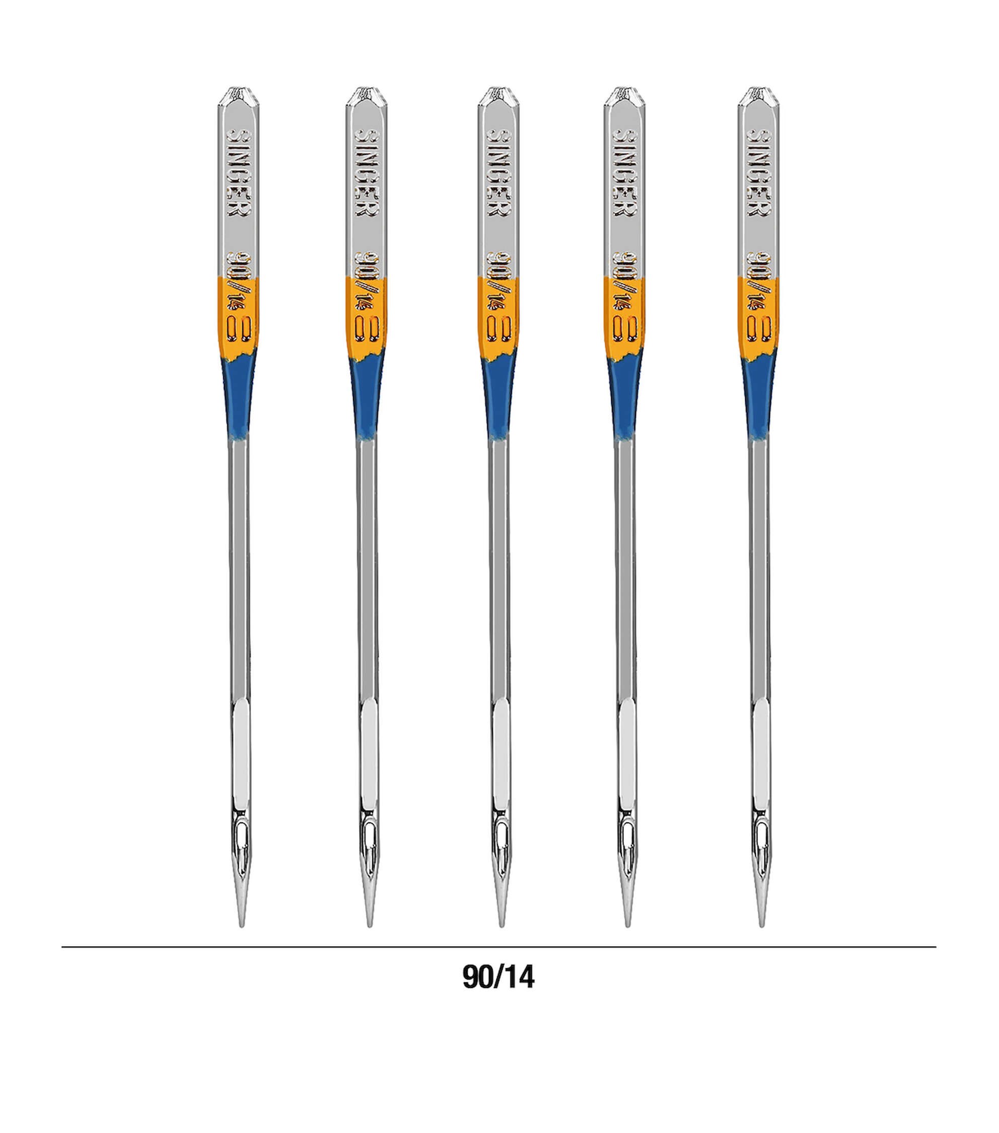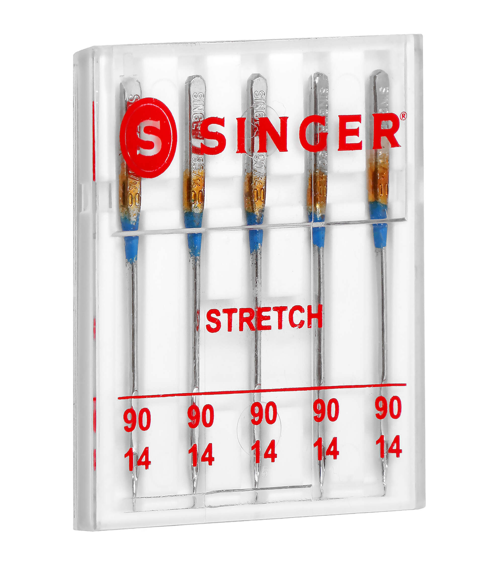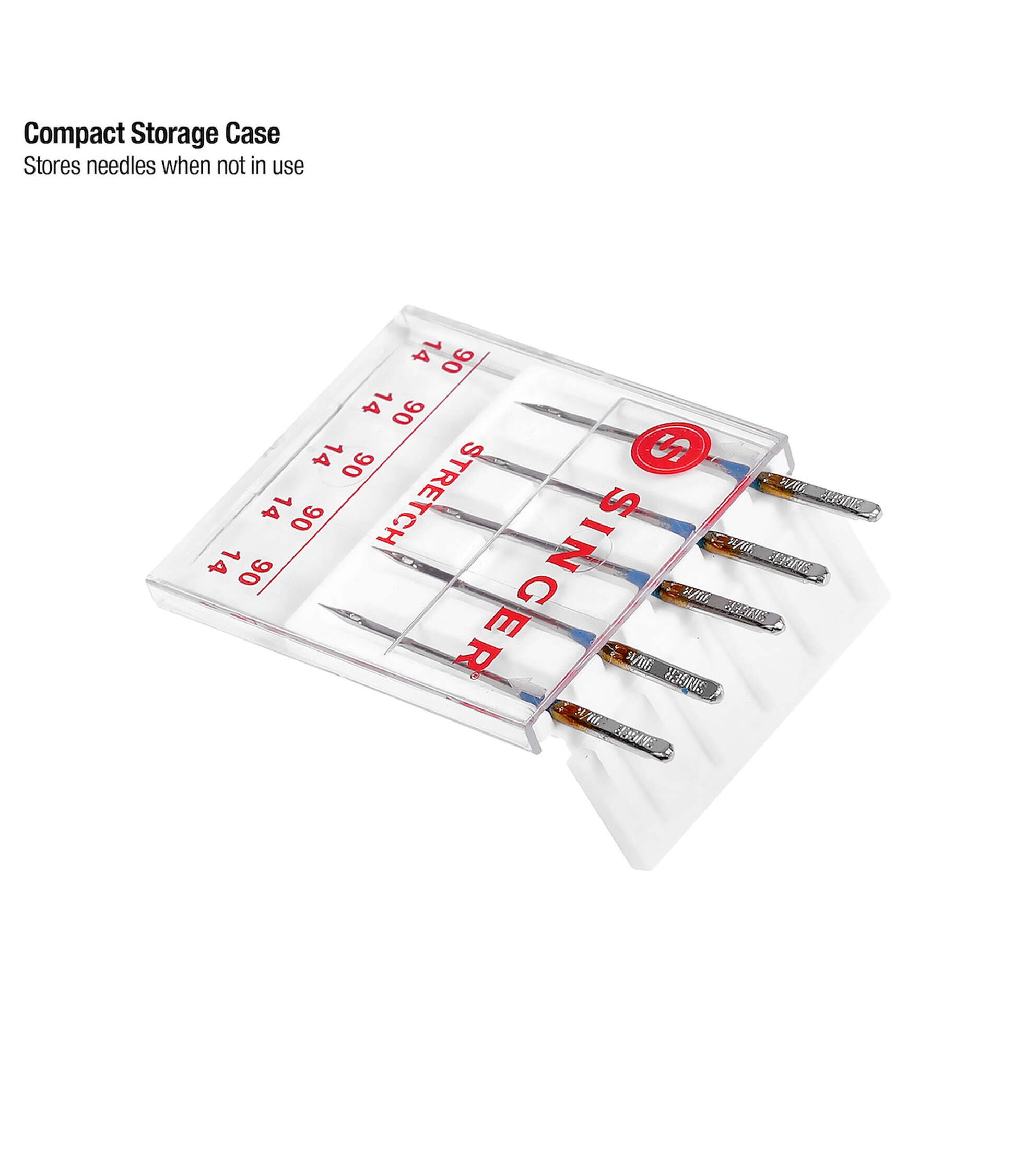 Use the Singer Universal Stretch Sewing Machine Needles to prevent skipped stitches when working on spandex, lycra and suedes. This pack contains five size 90/14 needles that are often used on extremely stretchy clothing such as swimsuits and gym wear. They come in a compact case with sizing marked on the cover.
