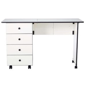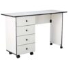 - Includes a sewing table features four drawers for supply storage and locking casters for easy mobility