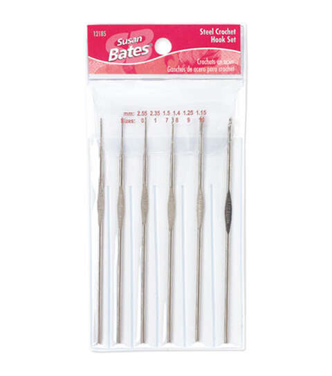 SUSAN BATES-Steelite Crochet Hook Set. These hooks are made of the finest nickel plated steel for crocheting the finest crochet thread lace projects. The 4x7x3/4in vinyl case is perfect to store your hooks safely. This set includes (10) 1.15mm; (9) 1.25mm; (8) 1.4mm; (7) 1.5mm; (1) 2.35mm; and (0) 2.55mm. Imported.